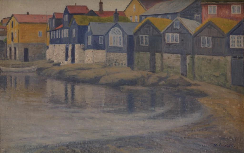 Niels Bjerre, duński malarz XX wieku, jest znany z przedstawiania codziennego życia i krajobrazów skandynawskich. Pod wpływem impresjonizmu wypracował styl łączący realizm z poezją. Jego podróże po wyspach Faroer odcisnęły piętno na jego twórczości, pozwalając mu uchwycić esencję tych odosobnionych miejsc. Druk artystyczny Vieilles maisons à Tórshavn świadczy o jego przywiązaniu do lokalnej kultury i tradycyjnej architektury, jednocześnie oferując unikalną artystyczną perspektywę na ten często nieznany region.