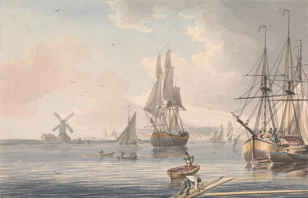 Obraz "Chantier naval de Deptford Kent" autorstwa Johna Cleveleya Młodszego ukazuje z niezwykłą precyzją ożywienie stoczni w XVIII wieku. Białe żagle statków wyrastają na tle jasnoniebieskiego nieba, podczas gdy robotnicy pracują przy drewnianych kadłubach. Ciepłe, ziemiste kolory portu kontrastują z chłodniejszymi odcieniami wody, tworząc dynamiczną i pełną życia atmosferę. Technika Cleveleya, łącząca akwarelę i olej, nadaje dziełu szczególne światło, zachęcając widza do zanurzenia się w tę pełną życia scenę morską.