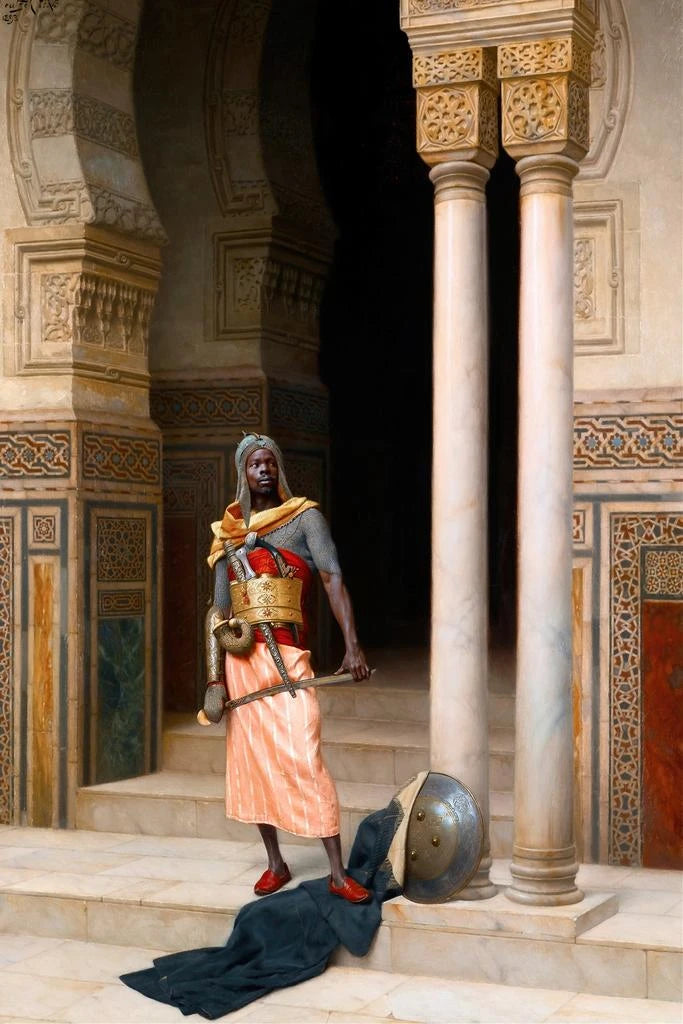 L'œuvre "Garde nubien" de Ludwig Deutsch nous plonge dans un univers riche en couleurs et en détails. La toile dépeint un garde majestueux, vêtu d'une tenue traditionnelle, se tenant avec fierté. Les nuances dorées et terreuses, mêlées à des touches de bleu profond, créent une atmosphère à la fois sereine et imposante. La technique de Deutsch, caractérisée par un réalisme minutieux, permet de ressentir la texture des tissus et la chaleur du climat. Chaque élément de la composition, des ornements aux expressions, raconte une histoire, invitant le spectateur à explorer les traditions nubiennes.