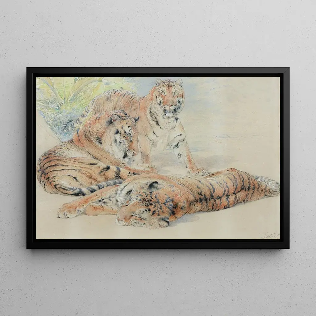 Studium tygrysów: spojrzenie na majestat kota Dzieło "Studium tygrysów" Williama Hugginsa uchwyca siłę i grację tych majestatycznych drapieżników. Ciepłe, ziemiste kolory, połączone z akcentami czerni i pomarańczy, przywołują zarówno ciepło ich naturalnego środowiska, jak i surową siłę tych stworzeń. Technika artysty, łącząca realizm z odrobiną ekspresjonizmu, pozwala odczuć intensywność spojrzeń tygrysów. W tej kompozycji każdy szczegół, od pasów po wyrzeźbione mięśnie, jest starannie oddany, tworząc atmosferę zarówno dziką, jak i fascynującą. William Huggins: mistrz realistycznego przedstawiania zwierząt William Huggins, działający w XIX wieku, jest znany z przedstawień zwierząt, zwłaszcza kotowatych. Pod wpływem naukowych eksploracji swojej epoki, potrafił połączyć sztukę z dokładną obserwacją natury. Huggins często współpracował z naturalistami i zoologami, co wzbogaciło jego zrozumienie zachowań zwierząt. Jego styl, zakorzeniony w realizmie, wyznaczył epokę, w której fascynacja dziką fauną osiągnęła szczyt. "Studium tygrysów" świadczy o jego umiejętności uchwycenia nie tylko wyglądu, ale także istoty tych stworzeń. Dekoracyjny druk artystyczny o wielu zaletach Wybór reprodukcji "Studium tygrysów" do swojego wnętrza to decyzja o dodaniu dzieła, które wnosi odrobinę egzotyki i wyrafinowania. Niezależnie od tego, czy jest to salon, biuro czy sypialnia, ten obraz przyciąga wzrok i budzi podziw. Jakość druku gwarantuje wierne oddanie szczegółów oryginalnego dzieła, jednocześnie oferując nowoczesną estetykę. Wkomponowując ten druk artystyczny w swoją dekorację, tworzysz przestrzeń, która nawiązuje do dzikiej natury, pozostając jednocześnie elegancka i stylowa.