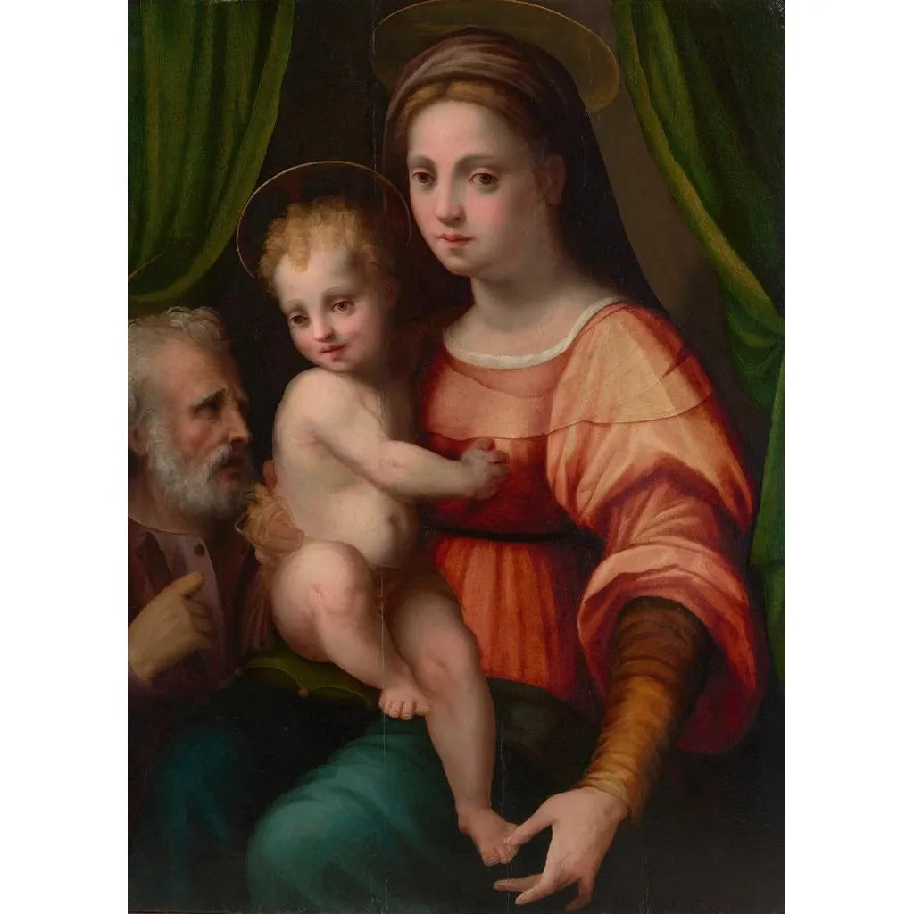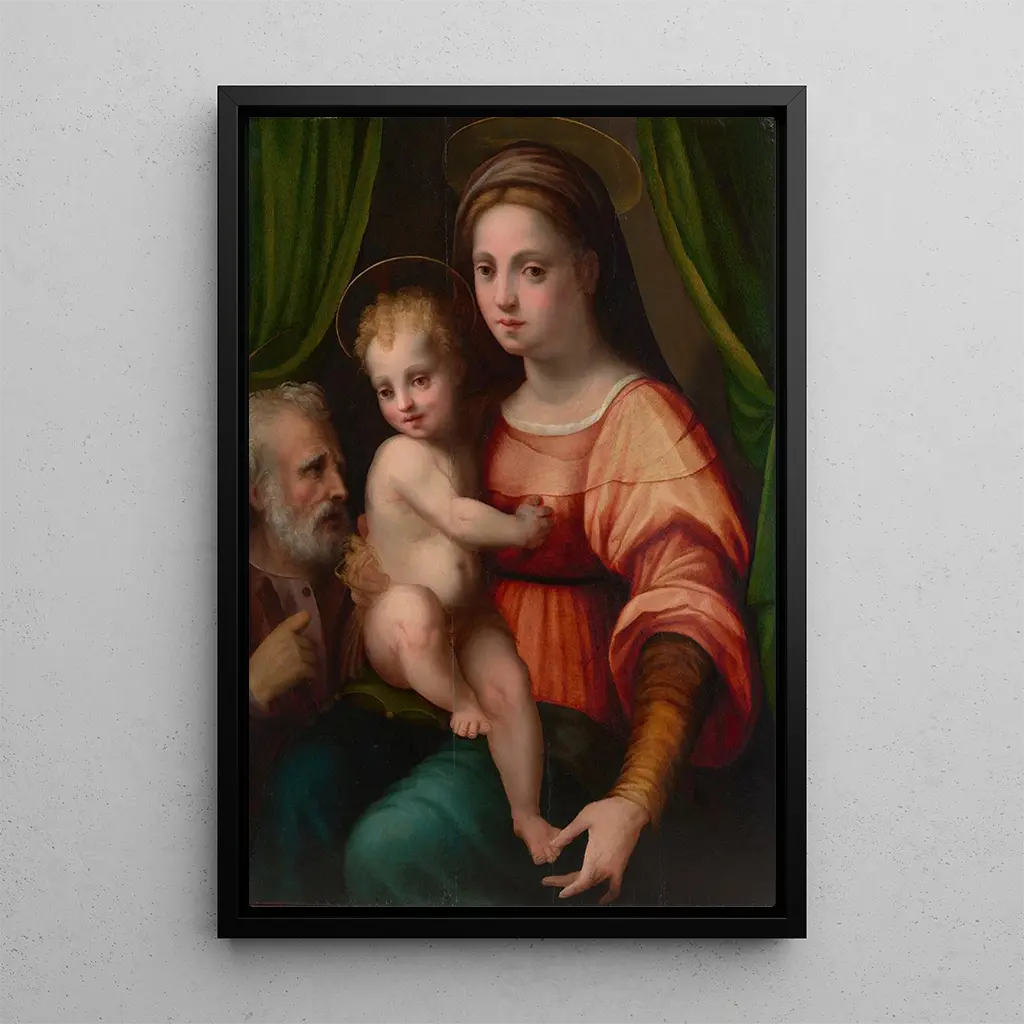 La reproduction de La Sainte Famille évoque une atmosphère de sérénité et de protection. Les figures de Marie, Joseph et l'Enfant Jésus sont représentées avec une tendresse palpable, leurs expressions douces et bienveillantes. Les couleurs chaudes, dominées par des tons ocre et dorés, créent une ambiance chaleureuse, tandis que la lumière semble émaner de la scène elle-même, illuminant les visages des personnages. La technique de Domenico Puligo, mélangeant le clair-obscur et des détails minutieux, donne vie à cette œuvre, invitant le spectateur à contempler la beauté de la vie familiale sacrée.