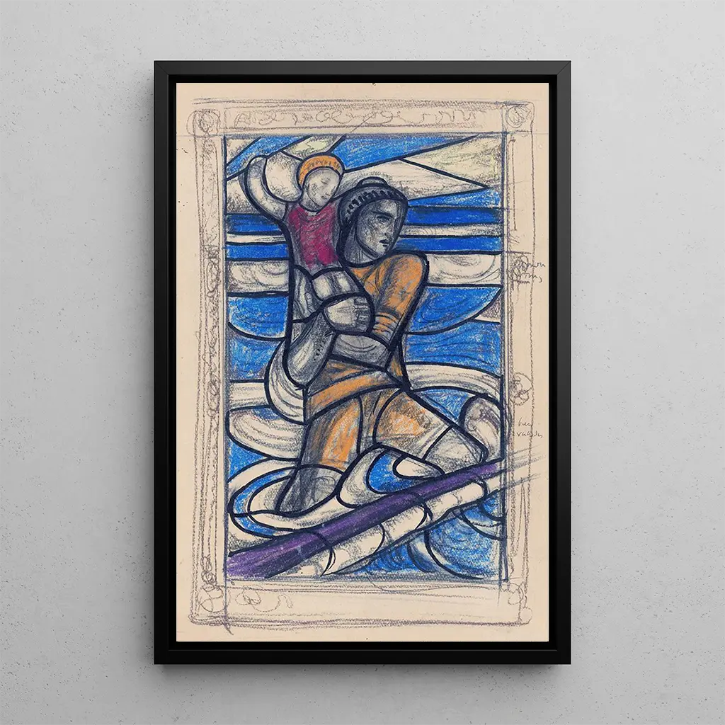 W "Saint Christophe" Richard Nicolas Roland Holst przedstawia uderzającą wizję patrona podróżnych. Dzieło emanuje atmosferą siły i oddania, gdzie imponująca postać Świętego Chrystofa jest podkreślona przez bogate kolory i drobiazgowe detale. Dynamiczna kompozycja, skoncentrowana na sylwetce świętego niosącego Dzieciątko Jezus, wywołuje uczucie ruchu i ochrony. Odmiany niebieskiego i złota tworzą silny kontrast, wzmacniając wizualny efekt tej ikonicznej sceny. Ten druk artystyczny zachęca do refleksji nad wiarą i bezpieczeństwem, jednocześnie celebrując piękno duchowości.