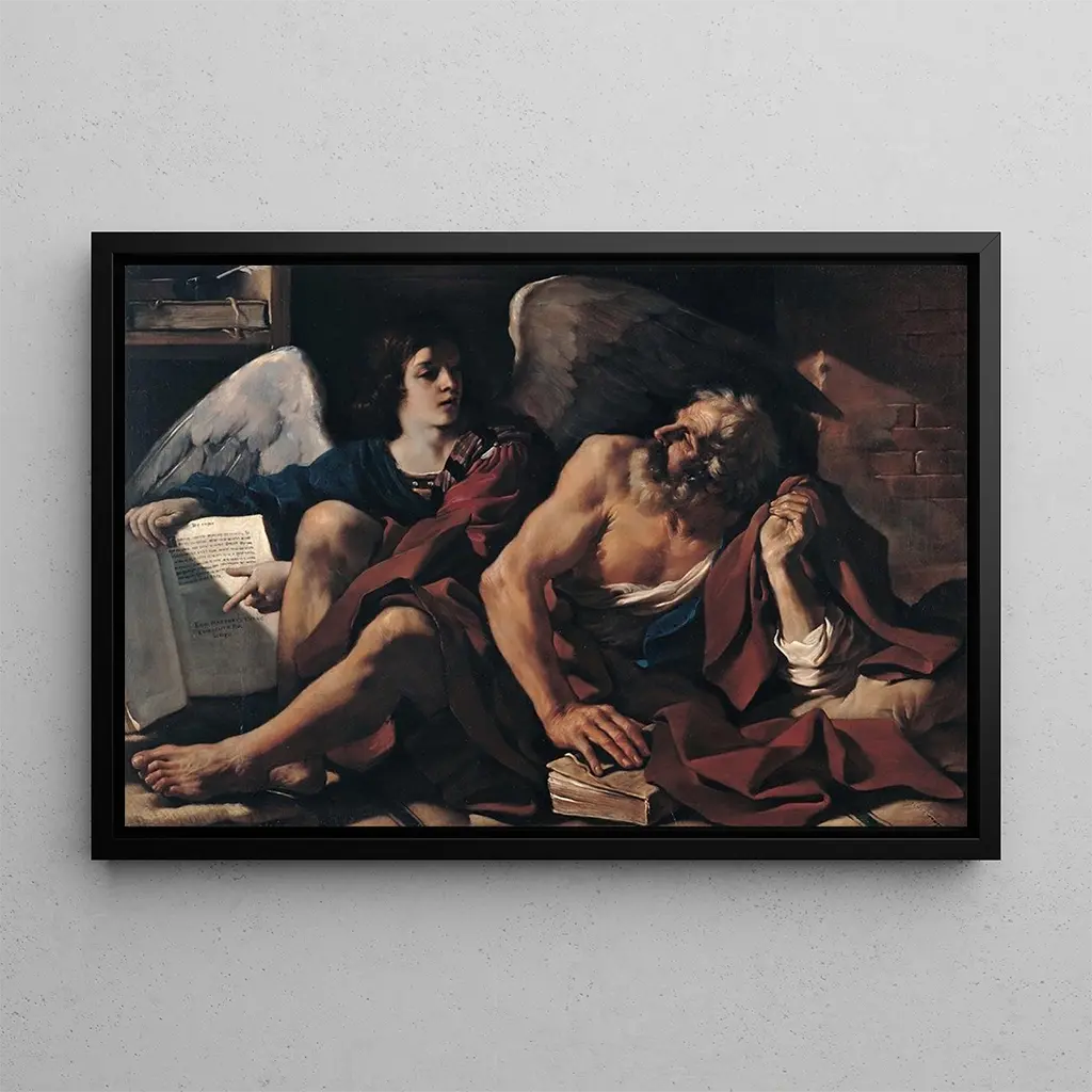 Dans cette œuvre emblématique, Guercino capture un moment d'intense spiritualité où Saint Matthieu, le saint évangéliste, est guidé par un ange. La composition est marquée par des contrastes saisissants entre les ombres profondes et les lumières éclatantes, typiques du clair-obscur. Les couleurs chaudes, allant des bruns terreux aux dorés lumineux, créent une atmosphère à la fois intime et sacrée. La technique de la peinture à l'huile permet de donner vie aux expressions des personnages, rendant palpable l'émotion de cette rencontre mystique. Chaque détail, du drapé des vêtements aux plumes de l'ange, témoigne d'un soin minutieux qui invite à la contemplation.
