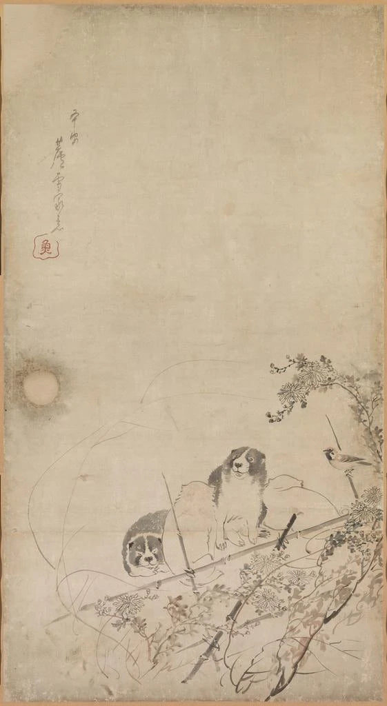 Druk artystyczny | Szczenięta, wróble i chryzantemy - Nagasawa Rosetsu