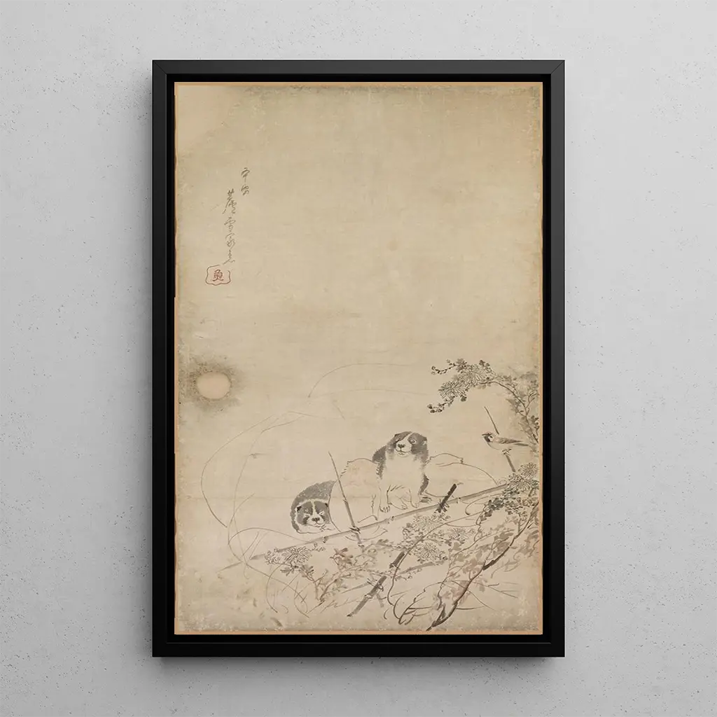"Chiots, moineaux et chrysanthèmes" autorstwa Nagasawa Rosetsu to żywe dzieło, które ukazuje radość życia poprzez elementy natury. Psotne szczenięta, otoczone kolorowymi mozaikami i chryzantemami, tworzą ożywioną i pełną uroku scenę. Jaskrawe kolory, od jasnych żółci po głębokie czerwienie, wprowadzają do kompozycji energię i dynamikę. Wyrafinowana technika Rosetsu, łącząca finezję linii i blask pigmentów, ożywia tę scenę, zachęcając widza do docenienia prostego piękna natury i zwierząt.