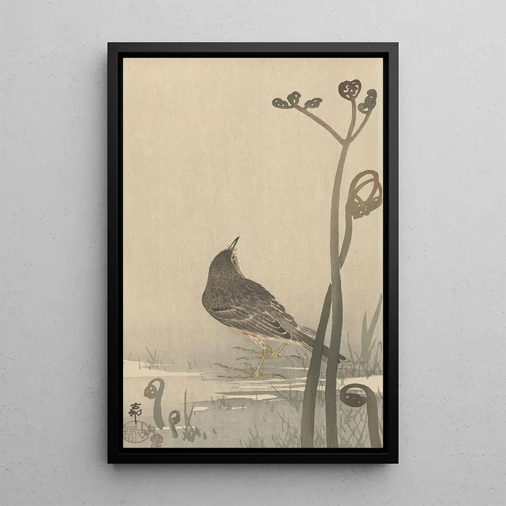 "Druk artystyczny" Ohara Koson to fascynujące dzieło, które wywołuje skojarzenia z płynnością i lekkością natury. Obraz przedstawia delikatnego ptaka, zamrożonego w chwili gracji, na tle bujającego się listowia. Delikatne kolory i drobiazgowe detale świadczą o mistrzostwie Kosona w sztuce drzeworytu. Użyta technika pozwala na stworzenie uspokajającej atmosfery, w której szum wody wydaje się niemal słyszalny. To dzieło zachęca do uważnej kontemplacji, ukazując ukrytą piękno w prostych momentach życia.