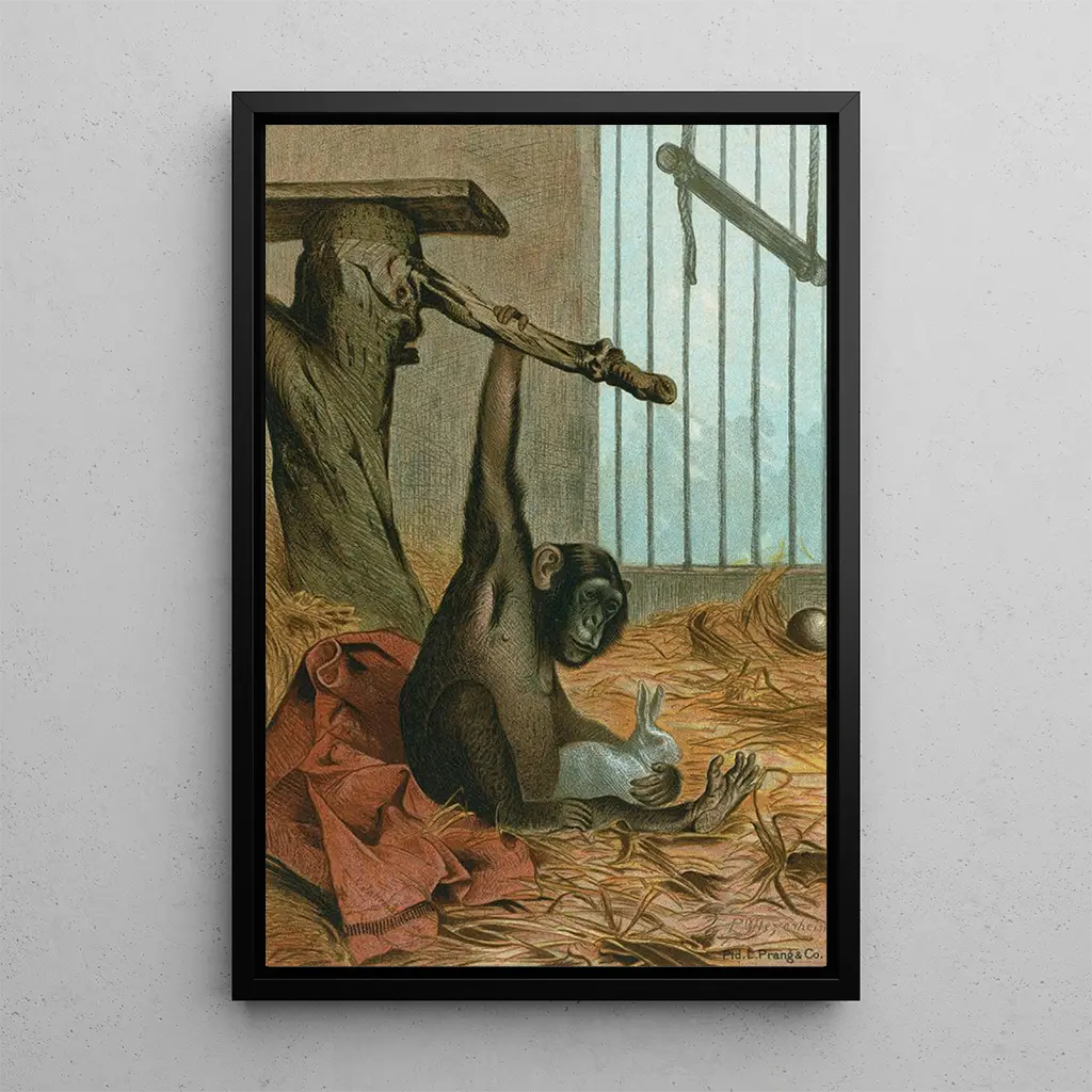 W tej reprodukcji obrazu "Chimpanzę" John George Wood przenosi nas w serce życia zwierzęcego, prezentując uderzającą reprezentację tego primata. Kolory ziemiste i odcienie zieleni nawiązują do tropikalnego lasu, podczas gdy technika akwareli nadaje całości lekkości. Atmosfera jest jednocześnie żywa i kontemplacyjna, zachęcając widza do obserwacji szczegółów futra i ciekawskiego wyrazu twarzy chimpanzę. To dzieło, zarówno realistyczne, jak i artystyczne, oddaje istotę zwierzęcia, przypominając o naszym związku z naturą.