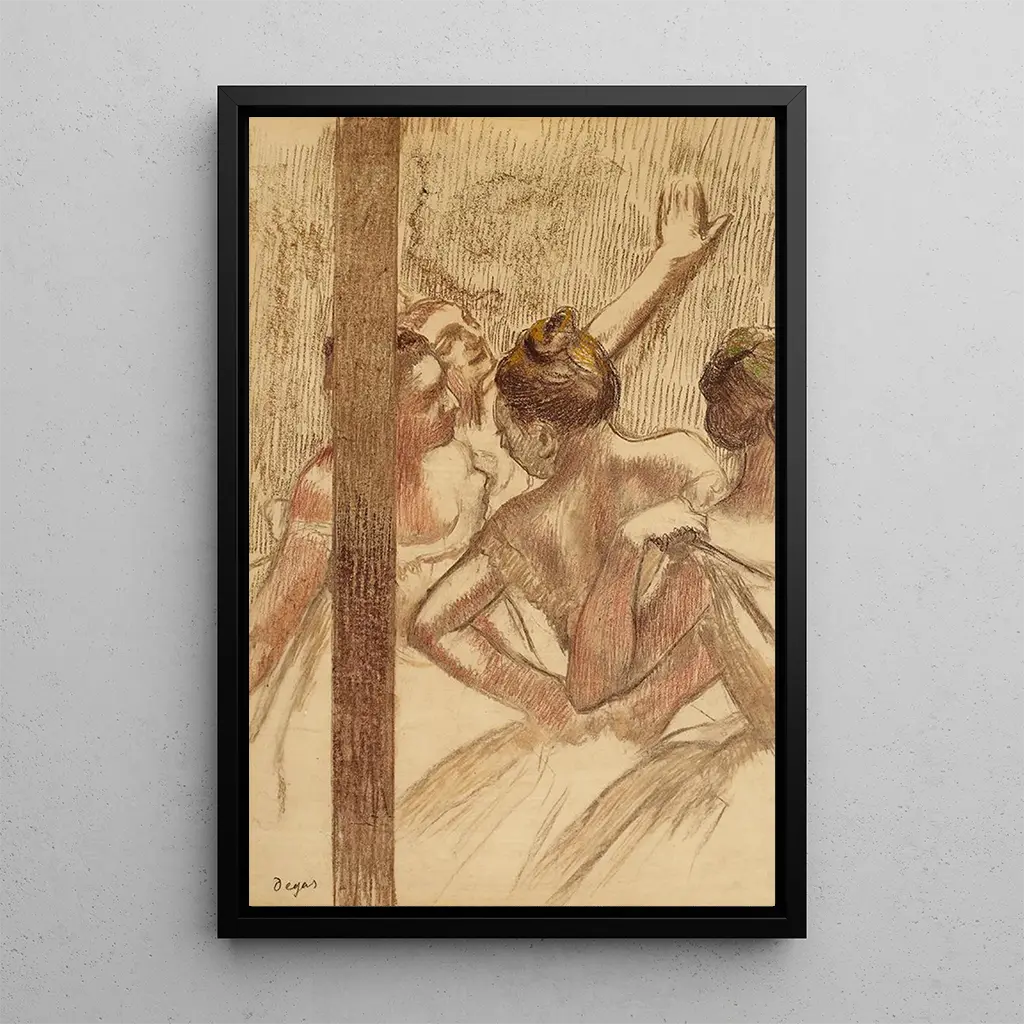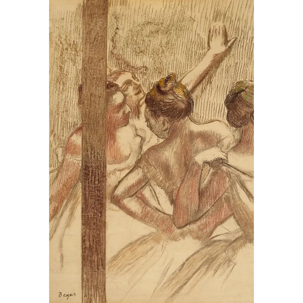 Dans l'œuvre "Danseuses", Edgar Degas capture l'essence même de la danse à travers une composition dynamique et vibrante. Les couleurs pastel se mêlent délicatement, créant une atmosphère légère et aérienne. Les figures des danseuses, figées dans des poses élégantes, semblent presque flotter sur la toile, évoquant le mouvement fluide de la danse classique. La technique du pastel, utilisée avec maestria par Degas, donne une texture unique à l'œuvre, accentuant les détails des costumes et des expressions des danseuses. Cette représentation artistique transcende le simple tableau pour devenir une véritable ode à la beauté du ballet.