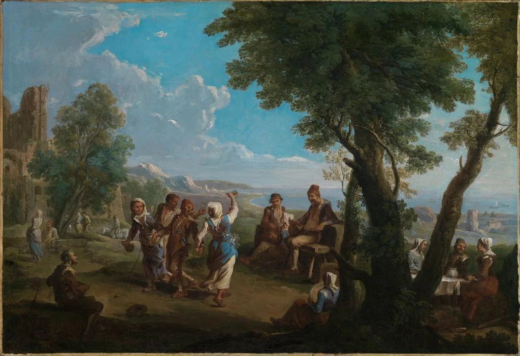 Danse paysanne devant une côte italienne : une célébration de la vie rurale