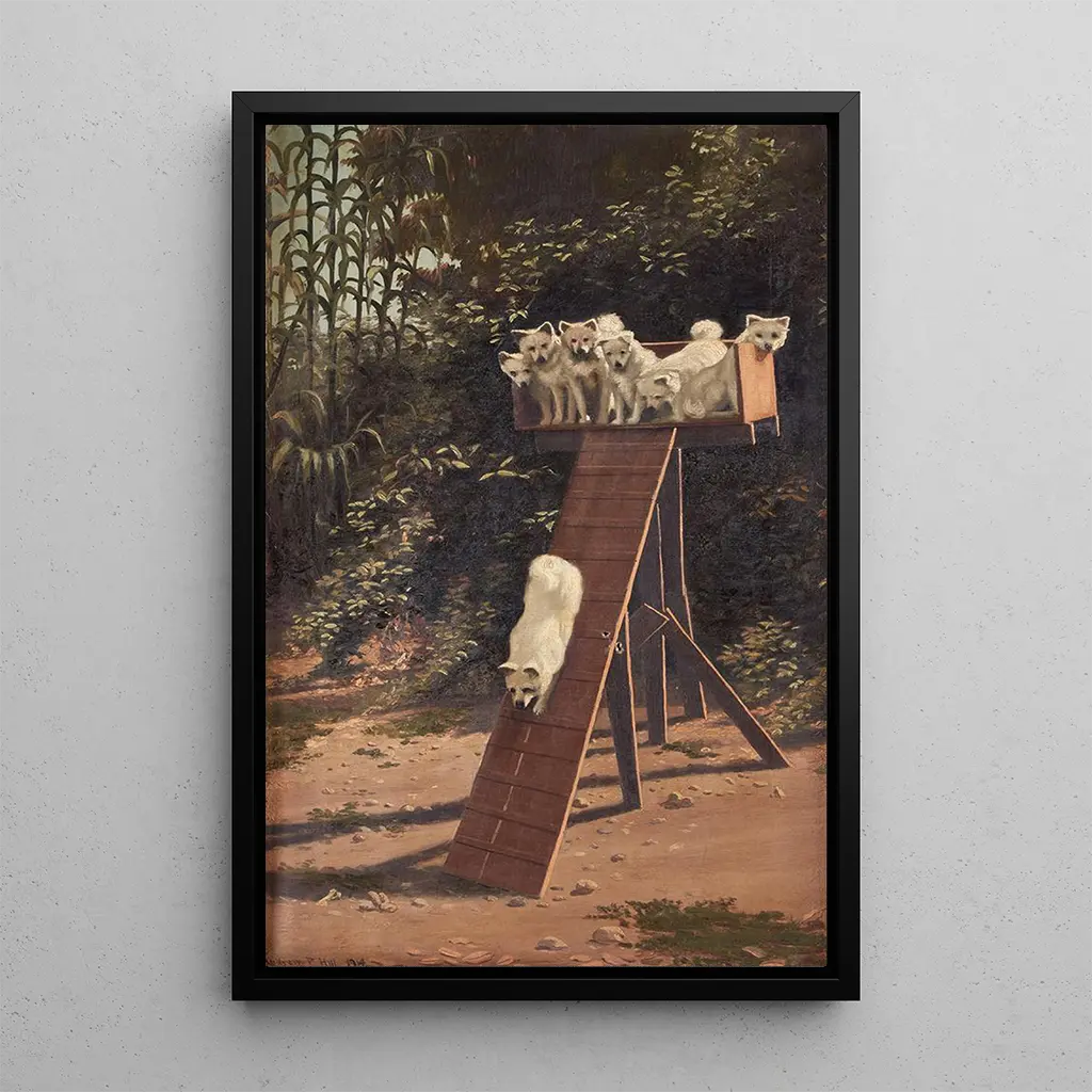 Andrew Putnam Hill, actif à la fin du XIXe siècle et au début du XXe siècle, est connu pour ses représentations de la vie quotidienne, souvent centrées sur des thèmes animaliers. Influencé par le mouvement impressionniste, Hill a su capturer des moments fugaces avec une grande sensibilité. Son travail reflète une époque où l'art se tournait vers des sujets plus accessibles et familiers, loin des grandes scènes historiques. « Dressage de chien » s'inscrit dans cette tradition, mettant en avant la beauté des interactions simples et authentiques entre les êtres vivants, tout en témoignant de l'évolution de la représentation artistique.