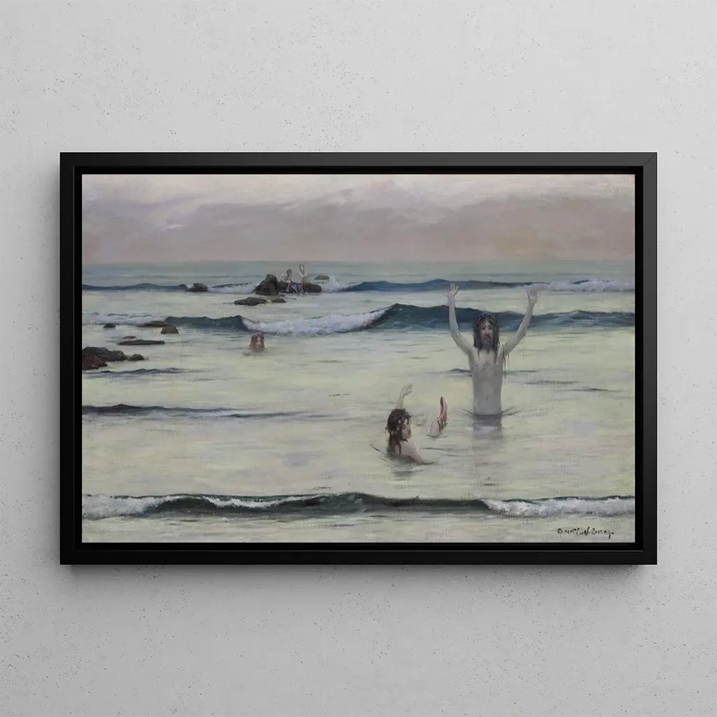 Tritons : hołd dla morskiego piękna Obraz "Tritons" autorstwa Ruperta Bunnya jest celebracją morza i jego mitycznych stworzeń. Na tym dziele Bunny przedstawia majestatyczne tritony, symbole siły i wodnej gracji. Żywe kolory i płynne ruchy postaci tworzą porywającą dynamikę, podczas gdy podwodna głębia rozświetla się migoczącymi refleksami. Atmosfera jest jednocześnie mistyczna i urzekająca, zapraszając widza do zanurzenia się w świat, gdzie natura i mit się spotykają. To poetyckie przedstawienie morza świadczy o talencie Bunny'ego w uchwyceniu piękna i zachwytu. Rupert Bunny : artysta nowoczesności Rupert Bunny, australijski malarz aktywny pod koniec XIX i na początku XX wieku, jest często kojarzony z impresjonizmem. Jego kariera była naznaczona podróżami po Europie, gdzie był pod wpływem wielkich mistrzów malarstwa. Bunny potrafił wprowadzić elementy australijskiej kultury do swoich dzieł, jednocześnie eksplorując uniwersalne tematy takie jak natura i mitologia. Jego styl, charakteryzujący się jaskrawymi kolorami i dynamicznymi kompozycjami, pozwolił mu wyróżnić się na tle ówczesnego pejzażu artystycznego, czyniąc go ważną postacią australijskiej sztuki. Dekoracyjny nabytek o wielu zaletach Druk artystyczny "Tritons" to element, który ozdobi Twoje wnętrze, niezależnie od tego, czy będzie to salon, łazienka czy biuro. Jakość druku i wierne odwzorowanie oryginału czynią go idealnym wyborem dla miłośników sztuki i dekoracji. Ten obraz wnosi morski i dynamiczny akcent, tworząc uspokajającą i inspirującą atmosferę. Wybierając ten druk, dodajesz do swojej kolekcji nie tylko dzieło sztuki, ale także element, który odzwierciedla piękno morza i bogactwo mitologii, wzbogacając tym samym Twoją przestrzeń życiową.