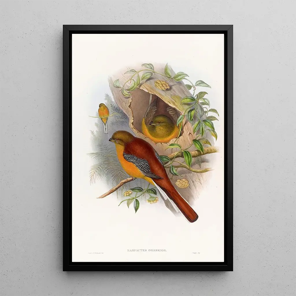 Trogon montagnard, z jego jaskrawymi kolorami i delikatnym upierzeniem, jest prawdziwym klejnotem natury. W tym druku artystycznym artysta uchwycił majestat tego ptaka, podkreślając jego żywe odcienie zieleni, niebieskiego i czerwieni. Kompozycja jest starannie wyważona, pozwalając obserwatorowi zanurzyć się w świat, gdzie fauna i flora harmonijnie się spotykają. Technika graweru używana przez Johna Goulda dodaje głębi i tekstury obrazowi, sprawiając, że każdy szczegół upierzenia jest niemal namacalny. Atmosfera emanująca z tego dzieła jest jednocześnie spokojna i fascynująca, zachęcając do podziwiania piękna różnorodności biologicznej.