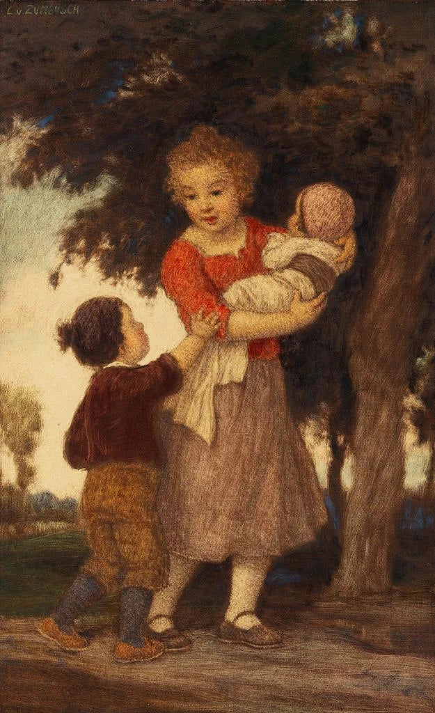 Ludwig von Zumbusch, principalement connu comme sculpteur, a également laissé une empreinte significative dans le monde de la peinture au XIXe siècle. Formé dans un contexte artistique riche, il a su intégrer des éléments de sculpture dans sa peinture, créant des œuvres d'une grande profondeur émotionnelle. "Les trois frères et sœurs" est emblématique de son approche, où la lumière et l'ombre jouent un rôle crucial dans la définition des formes et des expressions. Zumbusch a souvent exploré des thèmes familiaux et sociaux, témoignant de son intérêt pour la condition humaine et les relations interpersonnelles, ce qui confère à son œuvre une dimension universelle.