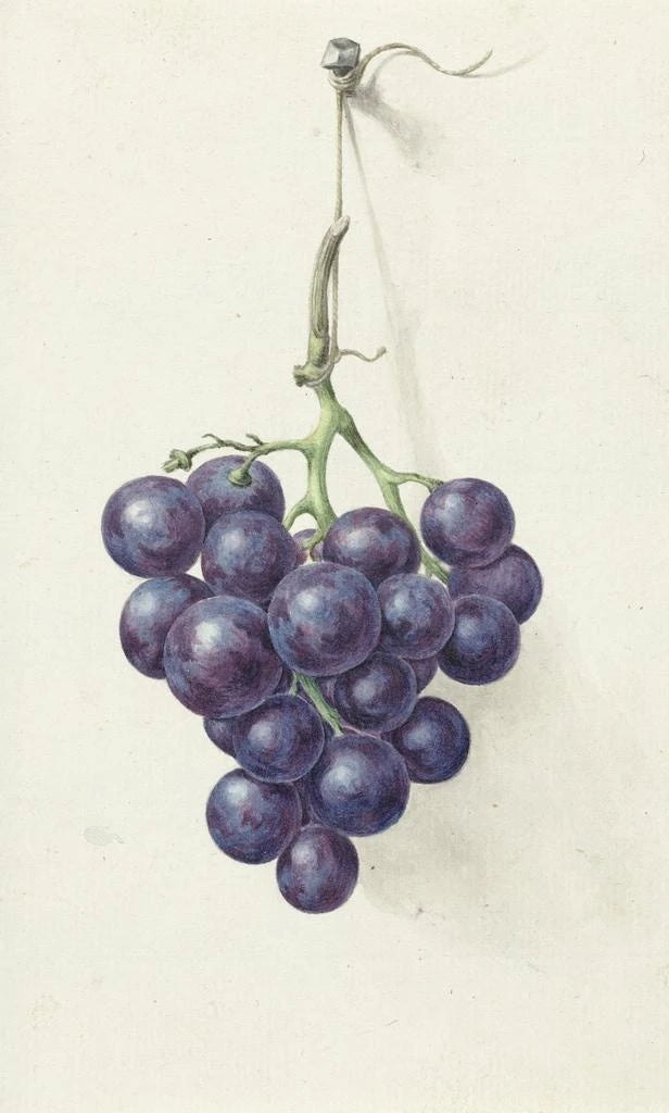 Druk artystyczny Trzy kiście niebieskich winogron Jean Bernarda jest celebracją natury i jej bogactw. To dzieło, bogate w szczegóły, ukazuje kiście winogron o głębokim, niemal tajemniczym odcieniu niebieskiego, które zdają się drgać pod światłem. Technika chiaroscuro używana przez artystę tworzy grę cieni i świateł, podkreślając okrągłość i teksturę owoców. Atmosfera emanująca z tego dzieła odzwierciedla bogactwo zbiorów i słodycz życia, zachęcając widza do delektowania się każdą chwilą.