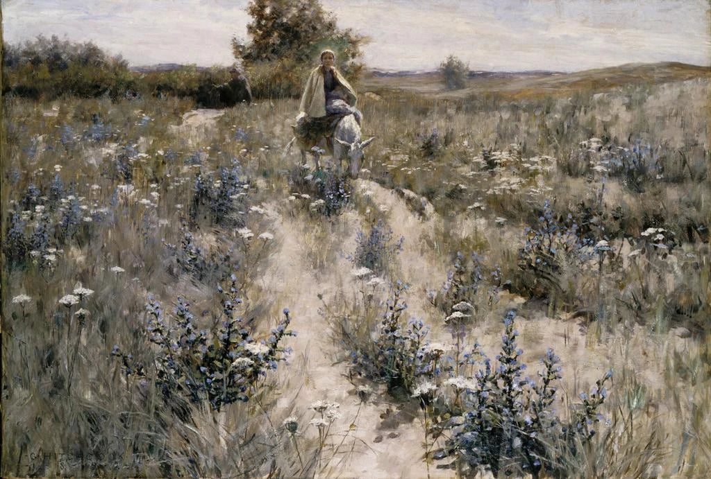 « La Fuite en Égypte » de George Hitchcock est une œuvre qui évoque un moment de grande intensité spirituelle et émotionnelle. La composition, riche en couleurs chaudes et terreuses, dépeint la Sainte Famille en fuite, cherchant refuge et sécurité. Les détails délicats des visages et des vêtements, ainsi que l'utilisation subtile de la lumière, créent une atmosphère empreinte de douceur et de mélancolie. Cette toile invite le spectateur à réfléchir sur le thème de la protection et de l'espoir, tout en offrant une vision poétique de la vie de la Sainte Famille.