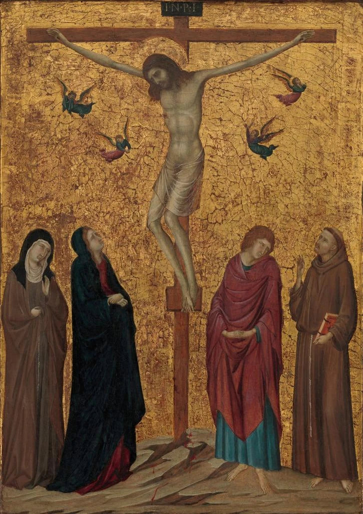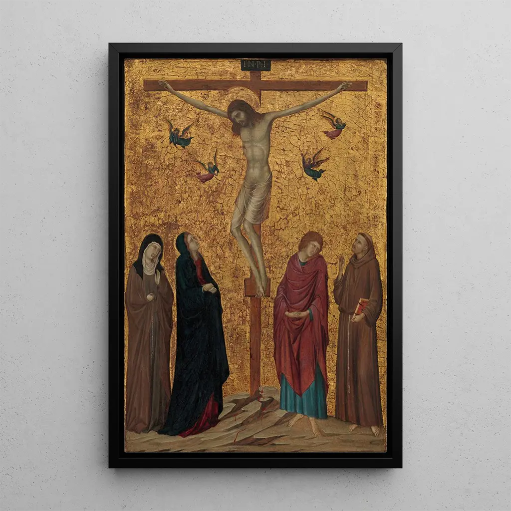Ugolino da Siena, actif au XIVe siècle, est un représentant majeur de l'école siennoise. Influencé par les traditions byzantines et les innovations de la peinture italienne, il a su développer un style unique, alliant rigueur et expressivité. Ses œuvres, souvent chargées de symbolisme religieux, témoignent d'une époque où l'art sacré jouait un rôle central dans la vie quotidienne. La Crucifixion illustre parfaitement son talent pour traduire des émotions profondes à travers des figures stylisées et des compositions harmonieuses. Son héritage perdure, inspirant de nombreux artistes à travers les siècles.