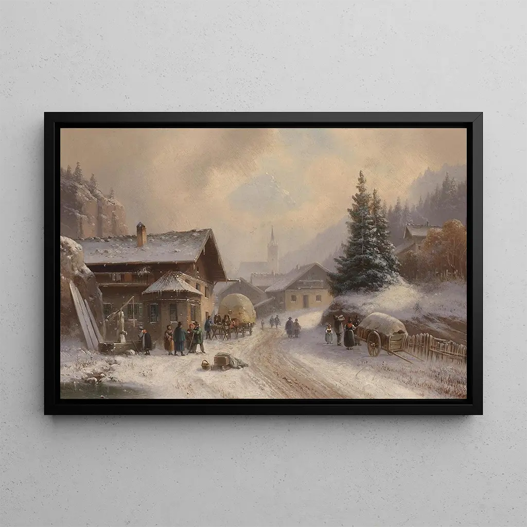 "Rue de village en hiver" d'Anton Doll évoque une atmosphère paisible et contemplative, où la neige recouvre délicatement les toits et les pavés. Les teintes froides de l'hiver se mêlent à des touches de lumière, créant un contraste saisissant qui attire le regard. La composition, soigneusement équilibrée, invite le spectateur à se plonger dans cette scène tranquille, où le temps semble suspendu. Les détails minutieux des maisons et des arbres, ainsi que la présence discrète des villageois, renforcent l'impression d'une vie simple et authentique, typique des paysages ruraux de l'époque.