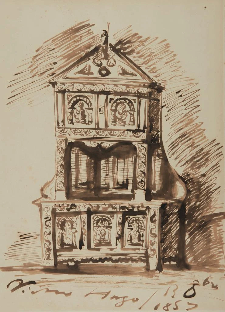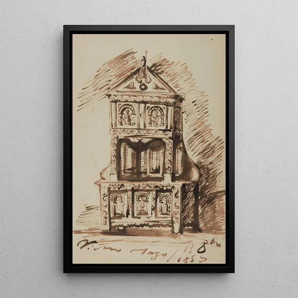 Obraz "Un bufet" autorstwa Victora Hugo przenosi nas do świata, w którym rzemiosło spotyka się z naturą. Kompozycja, bogata w szczegóły, podkreśla mebel z drewna rzeźbionego, ozdobiony delikatnymi motywami kwiatowymi. Ciepłe kolory, od głębokich brązów po łagodne zielenie, tworzą przytulną i serdeczną atmosferę. Technika malarska Hugo, łącząca realizm z romantyzmem, ożywia ten codzienny przedmiot, przemieniając go w pełnoprawne dzieło sztuki. Każdy pociągnięcie pędzla wydaje się opowiadać historię, zachęcając widza do zatrzymania się przy pięknie prostych rzeczy.