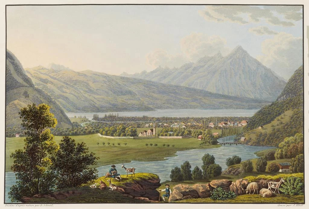 Druk artystyczny Unterseen i Interlaken autorstwa Davida Aloisa Schmida ukazuje zapierający dech w piersiach pejzaż alpejski, gdzie majestatyczne góry dumnie wznoszą się nad spokojnym jeziorem. Odmiany niebieskiego i zielonego harmonijnie się przenikają, tworząc atmosferę spokoju i zachwytu. Technika Schmida, polegająca na delikatnym pociągnięciu pędzla, pozwala uchwycić naturalne światło i odbicia na wodzie, zachęcając widza do zanurzenia się w tym czarującym obrazie. Każdy szczegół, od zaśnieżonych szczytów po zielone drzewa, przyczynia się do zrównoważonej i poetyckiej kompozycji.