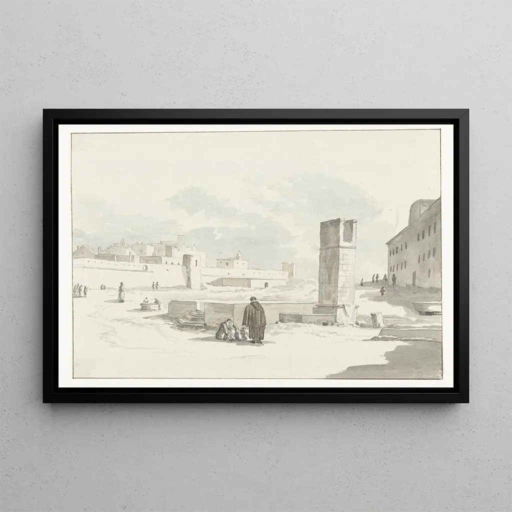 La reproduction de "Vue de la ville à Giovenazzo" d'Abraham Louis Rodolphe Ducros offre un aperçu captivant d'un paysage urbain historique. Cette toile présente une vue panoramique de la ville, où les bâtiments anciens se mêlent harmonieusement à la nature environnante. Les couleurs vives et les détails minutieux des façades créent une atmosphère vivante, presque palpable. La technique de l'aquarelle, maîtrisée par Ducros, permet de capturer la lumière et l'ombre d'une manière qui donne vie à cette scène. Chaque élément, des ruelles aux arbres, contribue à une représentation fidèle et poétique de la ville.