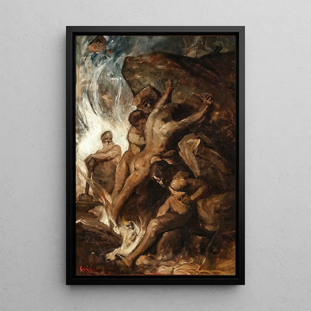 W "Vulcain w swojej kuźni" Gyula von Benczúr przenosi nas w serce tętniącej życiem sceny, gdzie bóg ognia, Vulcain, działa w swoim warsztacie. Dominują ciepłe kolory, przywołujące na myśl gorąc płomieni i siłę topniejących metali. Technika malarstwa olejnego, z jej drobiazgowymi detalami, ożywia tekstury materiałów i namacalną energię otoczenia. Atmosfera jest jednocześnie dynamiczna i mistyczna, uchwycając moment boskiego tworzenia, w którym sztuka i mitologia się spotykają.