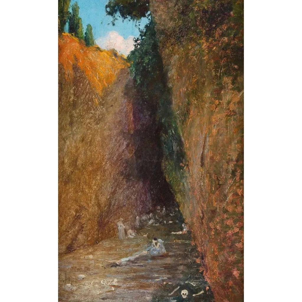 W dziele "Dans le canyon" Carl Arp przenosi nas w serce majestatycznego krajobrazu, gdzie skalne ściany wznoszą się z potęgą. Ciepłe, ziemiste kolory, połączone z akcentami zieleni, wywołują atmosferę jednocześnie spokojną i dziką. Technika artysty, który gra na cieniach i świetle, tworzy uderzającą głębię, zapraszając widza do zanurzenia się w tej wspaniałej naturze. Każdy szczegół, od warstw skały po delikatne liście, świadczy o wnikliwej obserwacji i wrażliwości na piękno świata naturalnego.
