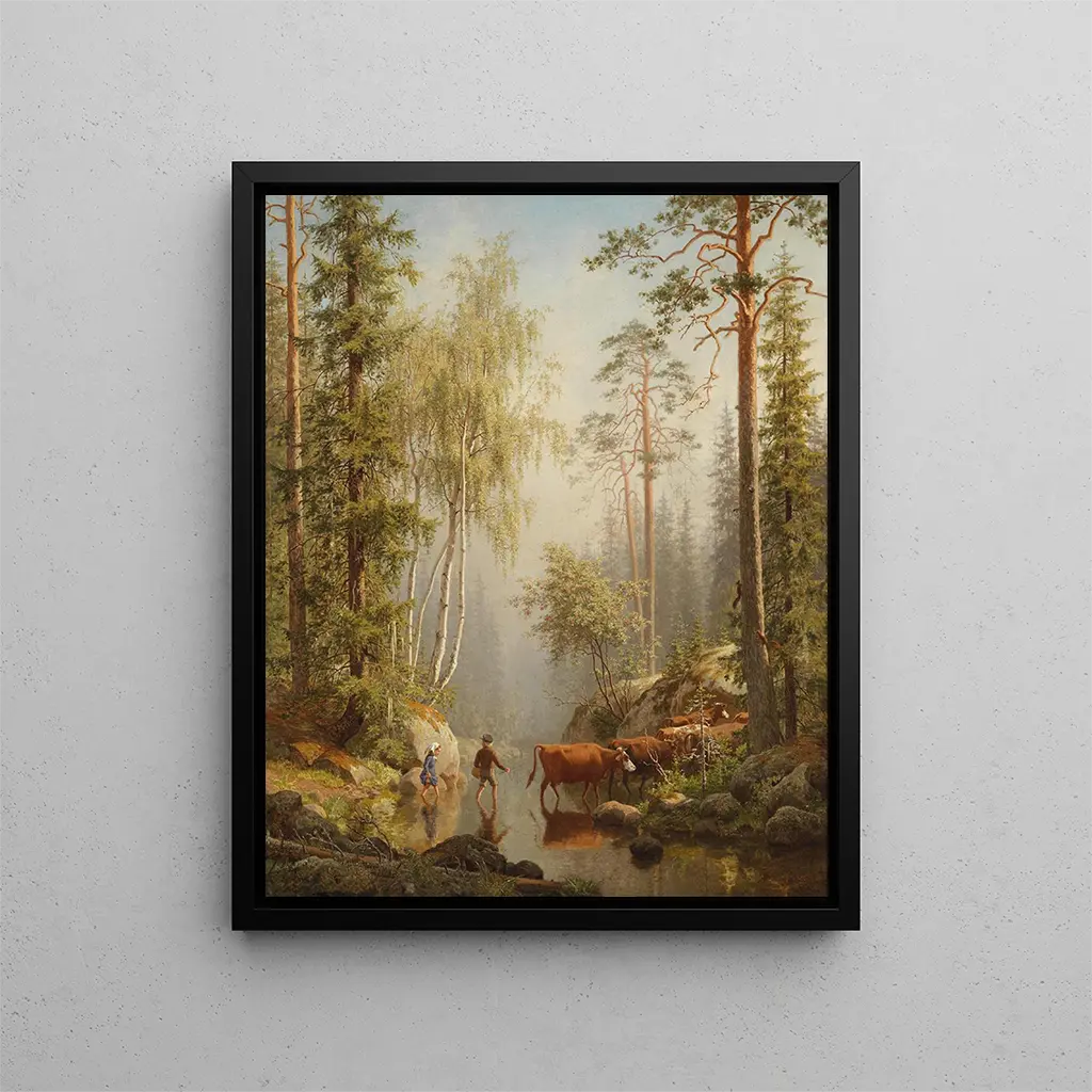 Reproduction W Strumieniu Leśnym - Carl Bøgh – Fascynujące wprowadzenie W bogatym i różnorodnym świecie historii sztuki niektóre dzieła potrafią uchwycić istotę natury z taką intensywnością, że zdają się przekraczać granice czasu. "W Strumieniu Leśnym - Carl Bøgh" jest jednym z tych mistrzowskich dzieł, które zapraszają widza do zanurzenia się w świat, gdzie spokój i dzika piękność harmonijnie współistnieją. To dzieło, pełne poezji, przywołuje wspomnienia dzieciństwa, spokojnych spacerów nad rzekami i magii bujnych lasów. Dzięki subtelnemu grze światła i koloru, Bøgh potrafi uczynić namacalnym delikatność zamrożonego momentu, w którym każdy szczegół, od szelestu liści po szum wody, zdaje się ożywać. Styl i wyjątkowość dzieła Styl Carla Bøgha charakteryzuje się impresjonistycznym podejściem, w którym światło odgrywa kluczową rolę w kompozycji. W "W Strumieniu Leśnym" malarz używa delikatnych pociągnięć koloru, aby przedstawić otaczającą roślinność i migoczące refleksy na powierzchni wody. Ten stylowy wybór nadaje dziełu niemal eteryczną atmosferę, w której widz może poczuć świeżość powietrza i wilgotność ziemi. Technika Bøgha, łącząca precyzję z wolnością, tworzy wrażenie ruchu i życia, jakby obraz był migawką sceny w ciągłym rozwoju. Paleta kolorów, zdominowana przez głębokie zielenie i uspokajające błękity, wywołuje naturalną harmonię, podczas gdy drobne szczegóły liści i gałęzi dodają dziełu wymiaru dotykowego. Artysta i jego wpływ Carl Bøgh, duński malarz XIX wieku, jest często kojarzony z ruchem romantycznym, który promuje wyrażanie emocji i celebrację natury. Jego fascynacja skandynawskimi krajobrazami i pragnienie uchwycenia piękna naturalnych środowisk odcisnęły piętno na jego drodze artystycznej. Bøgh potrafił czerpać inspirację od mistrzów swojego czasu, jednocześnie rozwijając własny, unikalny głos, czyniąc z niego pioniera w przedstawianiu pejzaży nordyckich. Jego dzieła, takie jak "W Strumieniu Leśnym", świadczą o...