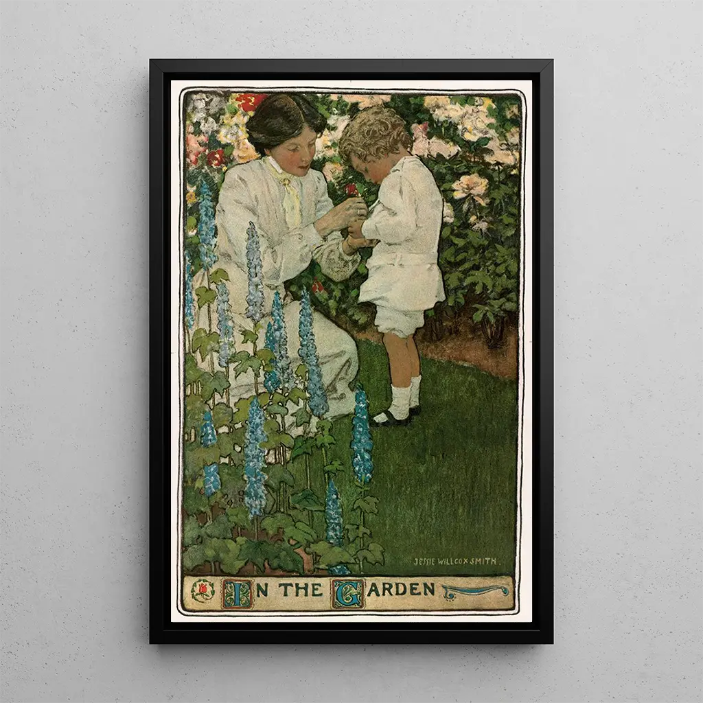 W ogrodzie, ikoniczne dzieło Jessie Willcox Smith, rozpościera scenę pełną spokoju i delikatności. Kompozycja przedstawia dziewczynkę, otoczoną jaskrawymi kwiatami i bujną zielenią, która zdaje się zatapiać w świecie marzeń. Pastelowe, subtelne i jasne kolory tworzą kojącą atmosferę, w której każdy szczegół jest starannie oddany. Technika artystki, łącząca akwarelę i rysunek, nadaje tej płótnie lekkość niemal eteryczną, zachęcając widza do zanurzenia się w tej bańce spokoju i dziecięcej niewinności.