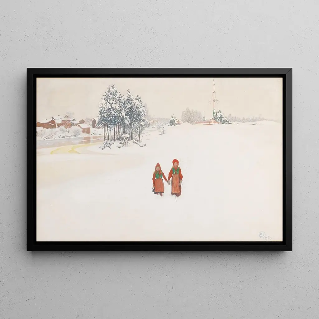 Reprodukcja "W śniegu" przenosi nas w czarujący zimowy pejzaż, gdzie śnieg delikatnie pokrywa ziemię i drzewa. Łagodne odcienie bieli i niebieskiego tworzą spokojną atmosferę, podczas gdy postacie, ubrani ciepło, wywołują uczucie ludzkiego ciepła w sercu zimna. Technika Carla Larssona, łącząca akwarelę i rysunek, ożywia tę scenę, uchwycając niewinność i radość dzieci bawiących się na śniegu. Każdy pociągnięcie pędzla zdaje się opowiadać historię, zachęcając do marzeń i kontemplacji.