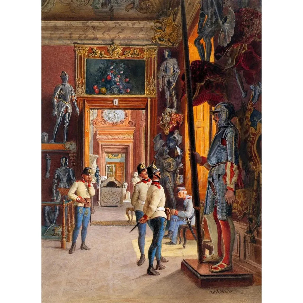 Carl Goebel Młodszy, malarz XIX wieku, jest ceniony za talent do uchwycenia scen pełnych szczegółów i emocji. Jego dzieło, często inspirowane historycznymi kolekcjami i pejzażami, świadczy o epoce, w której sztuka i kultura łączyły się blisko ze sobą. Pod wpływem artystycznych tradycji swojego czasu, Goebel wpisuje się w linię artystów dążących do uwiecznienia piękna obiektów i pejzaży. Chociaż nie jest tak sławny jak niektórzy jego rówieśnicy, jego praca pozostaje cennym wkładem w dziedzictwo artystyczne, oferując unikalny wgląd w kulturę swojej epoki.