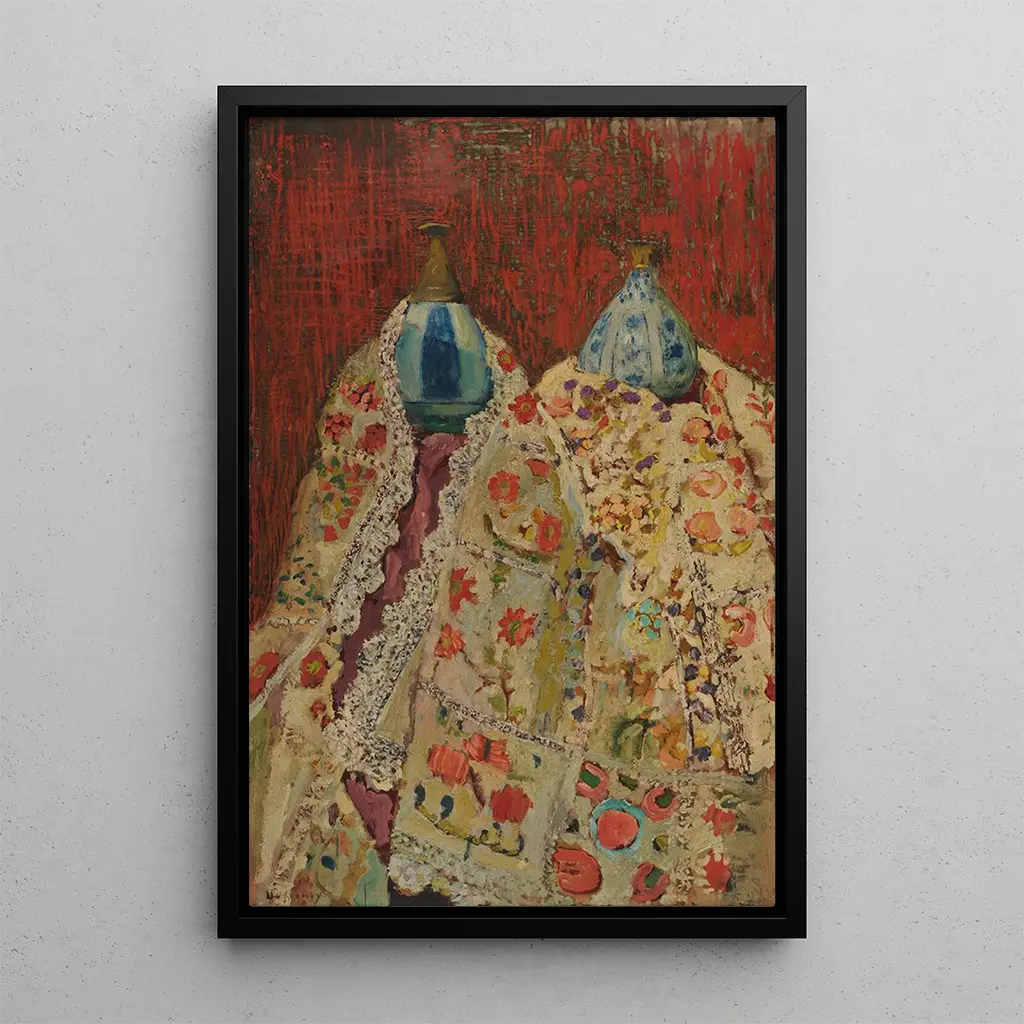 W "Wazonach i haftach" Georges Dufrénoy oferuje subtelną kompozycję, w której natura i rzemiosło się spotykają. Ten druk artystyczny przedstawia wazony ozdobione jaskrawymi kwiatami, otoczone wyrafinowanymi haftami. Żywe kolory i motywy kwiatowe tworzą radosną i żywą atmosferę, podczas gdy technika Dufrénoy, charakteryzująca się płynnymi pociągnięciami pędzla, ożywia każdy element. Dzieło wywołuje harmonię między naturą a sztuką, zachęcając widza do docenienia efemerycznej piękności kwiatów i precyzji detali.