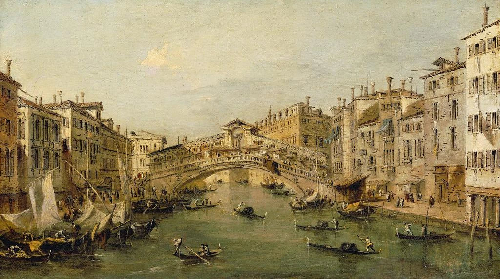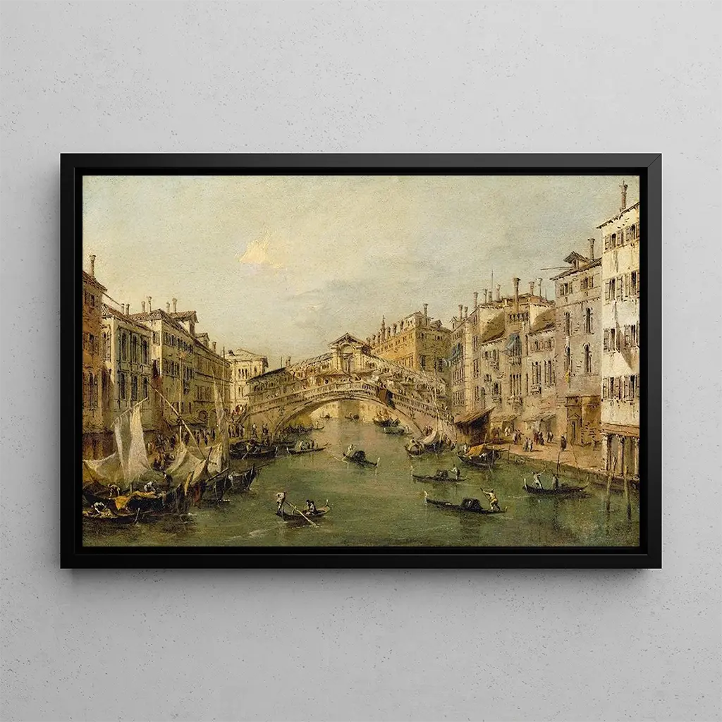 W "Venise, le Rialto" Francesco Guardi uchwycił istotę samej Serenissimy z poetycką delikatnością. Gondole płyną spokojnie po migoczących wodach, podczas gdy historyczne budynki odbijają się w kanale. Ciepłe i złote kolory przywołują światło weneckiego słońca, tworząc atmosferę jednocześnie żywą i nostalgiczną. Technika Guardiego, łącząca impresjonistyczne pociągnięcia z realistycznymi detalami, pozwala widzom poczuć tętniący życiem duch Wenecji, jakby można było usłyszeć szept wód i śpiew gondolierów.