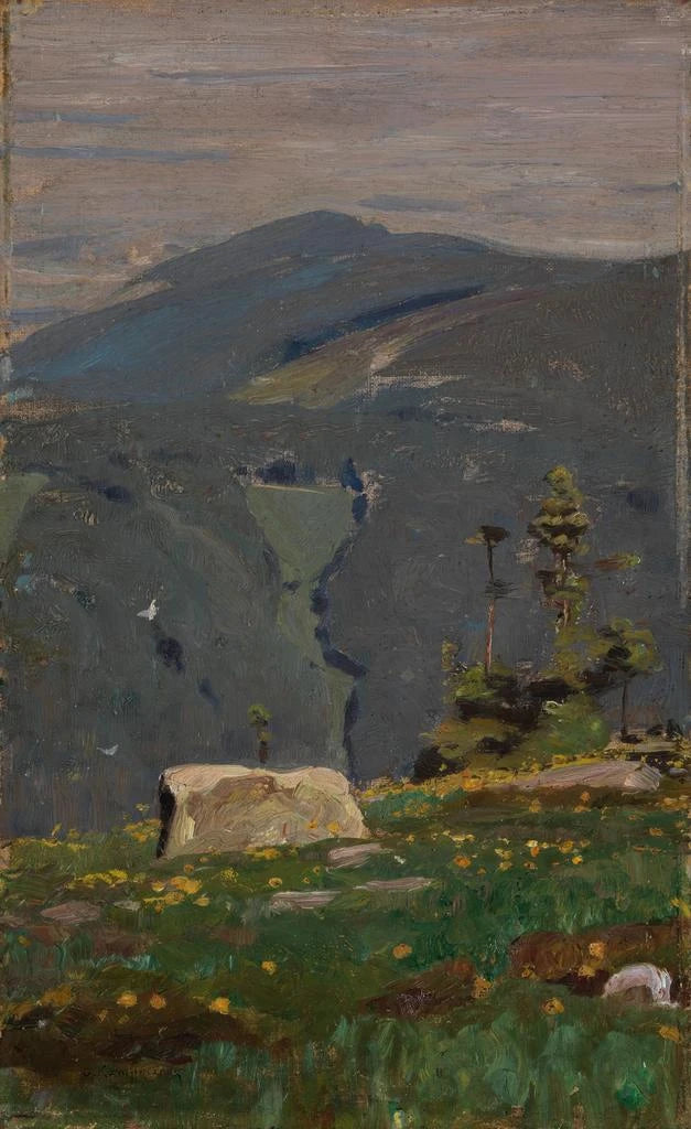 Druk artystyczny "Widok z Hornisgrinde" autorstwa Gustava Kampmanna przenosi nas w serce górskiego krajobrazu pełnego spokoju. Odcienie zieleni i błękitu harmonijnie się przenikają, przywołując na myśl świeżość szczytów i głębię dolin. Technika Kampmanna, łącząca precyzję z impresjonizmem, tworzy atmosferę ciszy i kontemplacji. Drobne szczegóły drzew i chmur, połączone z delikatnym światłem, zachęcają widza do zanurzenia się w tej zachowanej naturze. Każdy pociągnięcie pędzla wydaje się uchwycić esencję czystego powietrza gór, oferując kojące wrażenia wizualne.