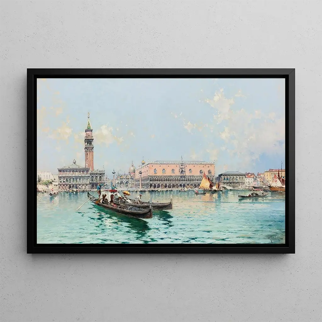 Obraz "Grand Canal Wenecja" autorstwa Franza Richarda Unterbergera przywołuje wspaniałość i elegancję miasta kanałów. To żywe dzieło ukazuje ruch gondoli płynących spokojnie po migoczących wodach, podczas gdy majestatyczne pałace weneckie wyrastają w tle. Żywe kolory i złote światło zachodzącego słońca tworzą romantyczną i urzekającą atmosferę. Unterberger, dzięki swojej umiejętności gry światłem i cieniem, potrafi przekazać istotę Wenecji, zapraszając widza do marzeń o jej wąskich uliczkach i urokliwych mostach.
