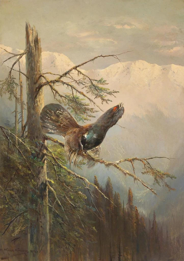 Dans cette œuvre captivante, Moritz Müller nous plonge au cœur d'une scène vivante où le grand tétras, majestueux oiseau des forêts, se livre à une parade nuptiale. Les couleurs vibrantes de ses plumes, allant du brun terreux aux éclats irisés, créent un contraste saisissant avec le vert luxuriant de son environnement. La technique de Müller, alliant précision et sensibilité, rend palpable l'atmosphère de ce moment éphémère. Chaque détail, des plumes délicatement rendues aux mouvements gracieux de l'oiseau, invite le spectateur à admirer la beauté de la nature et à ressentir l'énergie de cette danse aviaire.