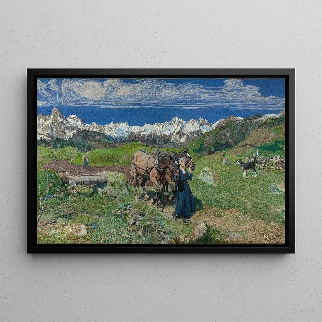 Printemps dans les Alpes : un souffle de vie et de lumière La reproduction de "Printemps dans les Alpes" de Giovanni Segantini évoque une explosion de couleurs et de lumière, capturant l'essence même du renouveau printanier. Les montagnes majestueuses, baignées de soleil, se dressent en toile de fond, tandis que la flore alpine s'épanouit dans un festival de teintes vibrantes. Segantini, avec sa technique de divisionnisme, utilise des touches de couleur juxtaposées pour créer une luminosité unique, donnant vie à cette scène idyllique. Les personnages, en harmonie avec leur environnement, semblent célébrer la beauté de la nature, invitant le spectateur à ressentir la joie et la vitalité de cette saison. Giovanni Segantini : le poète de la lumière Giovanni Segantini, né en 1858, est un artiste majeur du mouvement symboliste et du divisionnisme. Influencé par les paysages alpins de son enfance, il a consacré sa carrière à explorer la relation entre l'homme et la nature. Segantini a su transcender le simple paysage pour en faire un véritable poème visuel, où la lumière et la couleur jouent un rôle primordial. Sa quête de spiritualité à travers la nature et son engagement envers la représentation de la vie paysanne ont marqué son époque, faisant de lui une figure emblématique de la peinture alpine et un précurseur de l'art moderne. Une acquisition décorative aux multiples atouts La reproduction de "Printemps dans les Alpes" est une pièce décorative qui apportera une touche de fraîcheur et de dynamisme à votre intérieur. Que ce soit dans un salon, un bureau ou une chambre, ce tableau illuminera votre espace avec ses couleurs éclatantes et sa composition harmonieuse. Sa qualité d'impression garantit une fidélité remarquable aux détails de l'œuvre originale, tout en offrant un attrait esthétique indéniable. En choisissant cette toile, vous ne vous contentez pas d'embellir votre décoration, mais vous invitez également une part de la beauté naturelle des Alpes dans votre quotidien, créant ainsi un environnement inspirant et apaisant.