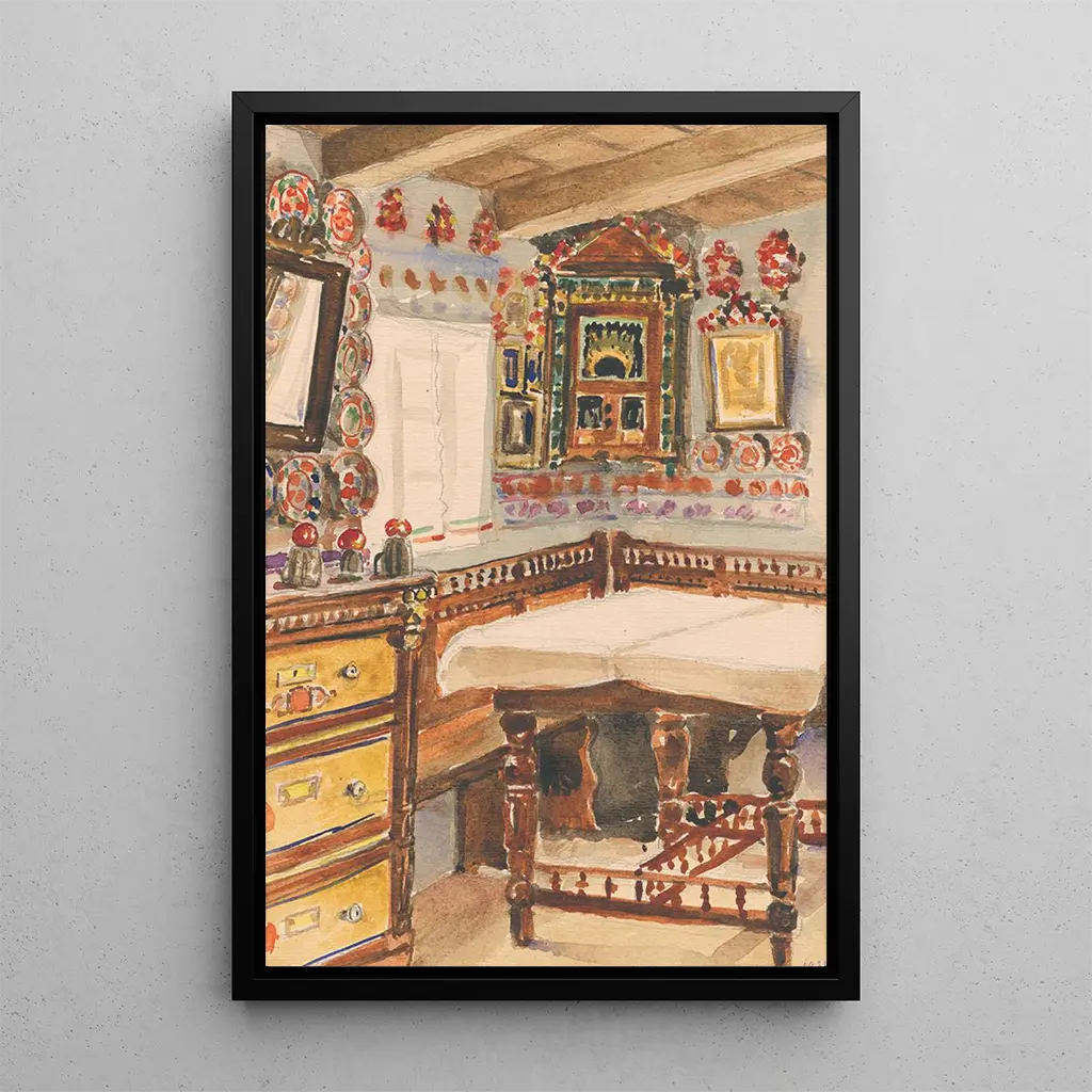 Druk artystyczny Wewnątrz domu wiejskiego w Martovce przenosi nas w intymność wiejskiego domu. Ciepłe, ziemiste kolory, zdominowane przez brązy i ochry, wywołują uczucie ciepła tętniącego życiem ogniska. Delikatne światło przenikające przez okna tworzy przytulną, niemal nostalgiczna atmosferę. Każdy element sceny, od rustykalnych mebli po naczynia kuchenne, opowiada historię codziennego życia, pracy i prostoty. Ten druk artystyczny jest prawdziwym świętem życia wiejskiego, zachęcając do docenienia piękna zwykłych chwil.