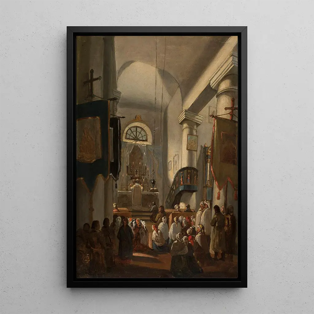 Reprodukcja Wnętrza kościoła z postaciami to idealny element dekoracyjny, który wzbogaci Twoje wnętrze, niezależnie od tego, czy jest to salon, biuro czy sypialnia. Jakość druku i wierne odwzorowanie szczegółów sprawiają, że jest to atrakcyjny wybór dla miłośników sztuki. Wkomponowując ten druk artystyczny w swoją aranżację, dodajesz elegancji i duchowości swojemu przestrzeni. Ten obraz, będący prawdziwym oknem na minioną epokę, z pewnością wzbudzi podziw gości i stworzy kojącą atmosferę.