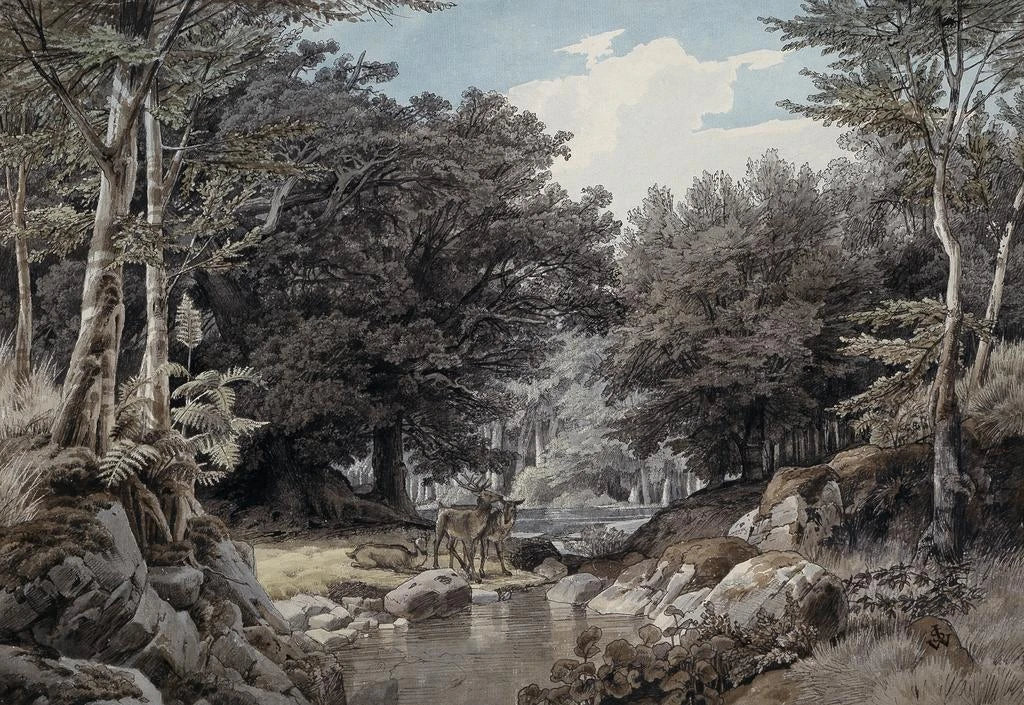 Wnętrze lasu z jeleniami w pobliżu wody - Johann Wilhelm Schirmer