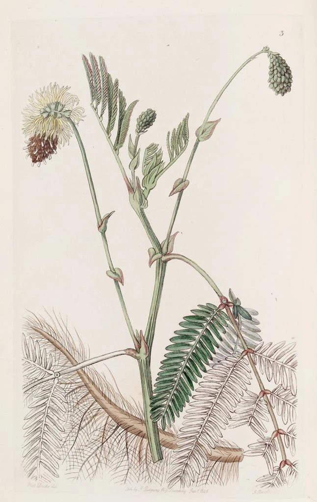 La sensitive aquatique double jaune, illustrée avec soin par Sydenham Edwards, est une œuvre qui célèbre la beauté des plantes aquatiques. Les teintes jaunes vives contrastent avec des nuances de vert et de bleu, créant un tableau vivant et dynamique. La technique de l'aquarelle permet de rendre la légèreté des pétales et la fluidité des formes, évoquant la grâce de cette plante qui flotte à la surface de l'eau. Cette représentation invite à la contemplation et à l'émerveillement devant la splendeur de la nature.
