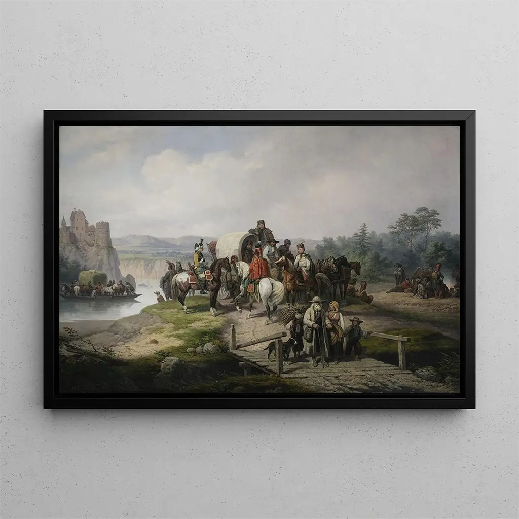 Druk artystyczny Chariots na Brzegu Rzeki autorstwa January Suchodolski przenosi nas w idylliczną atmosferę, gdzie natura i działalność ludzka harmonijnie się przeplatają. Ciepłe, ziemiste kolory dominują na płótnie, przywołując na myśl łagodność słonecznego dnia. Wózki, załadowane towarami, powoli przemieszczają się wzdłuż rzeki, podczas gdy postacie, ubrane w stroje z epoki, wydają się zaangażowane w codzienne zadanie. Technika Suchodolskiego, charakteryzująca się precyzyjnymi pociągnięciami pędzla i skrupulatną dbałością o szczegóły, ożywia tę scenę, zachęcając widza do odczuwania spokoju krajobrazu.
