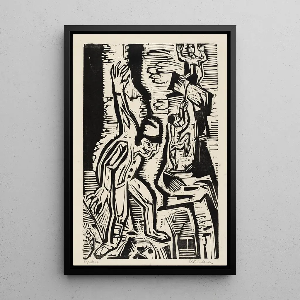 Ernst Ludwig Kirchner, né en 1880, est l'un des fondateurs du mouvement expressionniste en Allemagne. Influencé par le fauvisme et l'art primitif, il développe un style unique qui se caractérise par des formes déformées et des couleurs vives. Actif principalement dans les années 1910, Kirchner s'illustre par ses représentations de la vie urbaine et de la nature, cherchant à exprimer des émotions profondes à travers son art. "Les Alpinistes" témoigne de son intérêt pour les paysages naturels, un thème récurrent dans son œuvre, surtout après sa retraite dans les montagnes suisses, où il trouve refuge et inspiration.