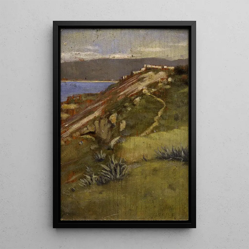 La druk artystyczny de Côte de Tanger nous transporte vers les rivages ensoleillés du Maroc, où la mer et la terre se rencontrent dans une danse de couleurs. Les nuances de bleu et de vert évoquent la tranquillité des eaux, tandis que les touches de terre cuite et de sable rappellent la chaleur du soleil sur la côte. La technique impressionniste de Norman Garstin se manifeste ici par des coups de pinceau vifs et expressifs, créant une atmosphère vivante et dynamique. Ce tableau invite à la contemplation, à l'évasion, et à la découverte d'un paysage à la fois familier et lointain.