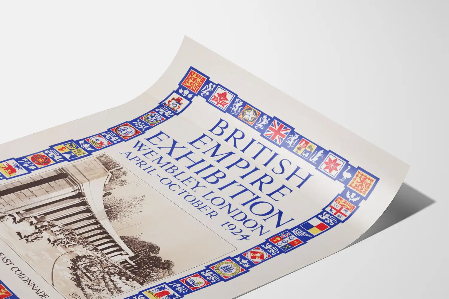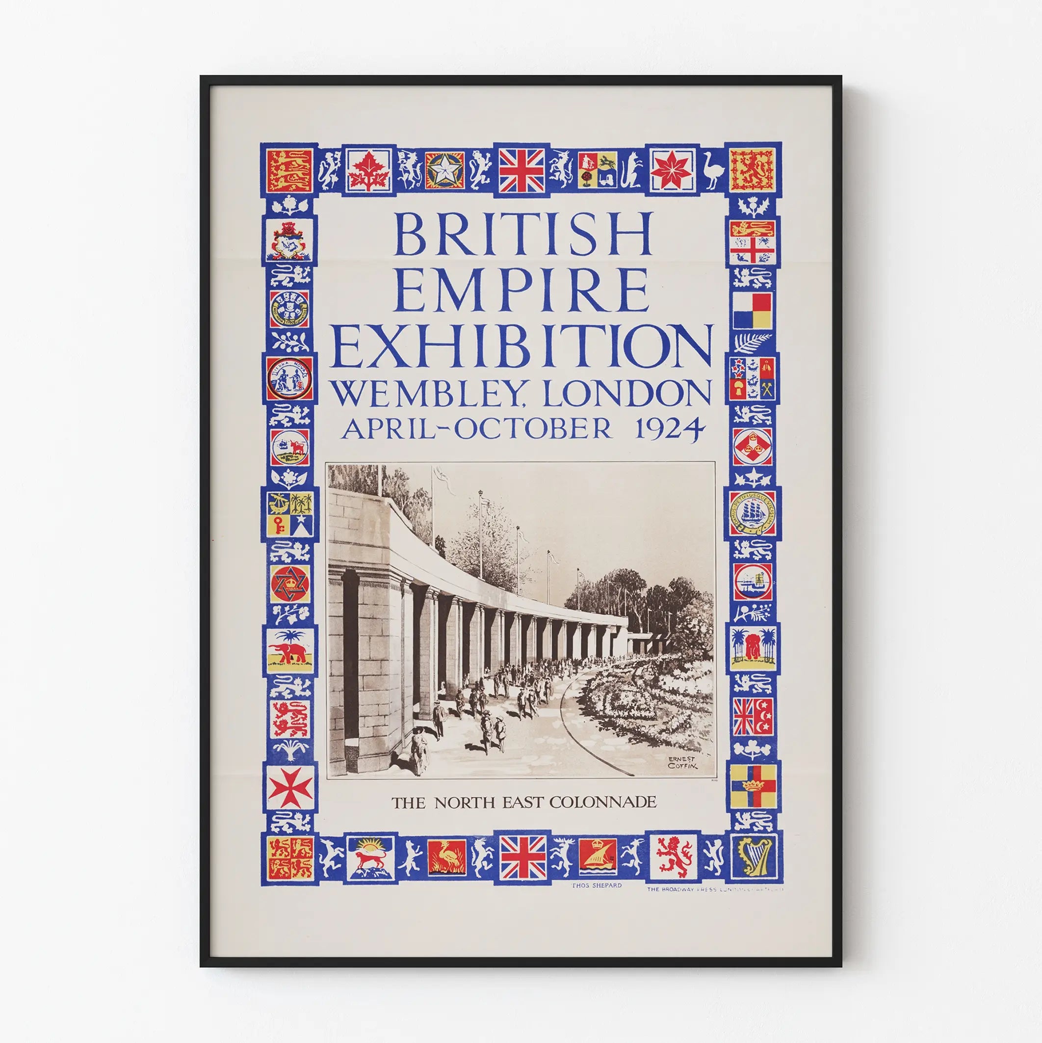Ta vintage plakat z wystawy Brytyjskiego Imperium, która odbyła się w Wembley w Londynie od kwietnia do października 1924 roku, to unikalny element dekoracji ściennej. Podkreśla on Kolumnadę Północno-Wschodnią, główny element architektoniczny wystawy, przedstawioną w czerni i bieli z realistyczną perspektywą autorstwa Ernesta Coffina. Plakat jest oprawiony w kolorową ramę, ozdobioną licznymi emblematami i herbami reprezentującymi różne kolonie i terytoria Brytyjskiego Imperium, w odcieniach niebieskiego, czerwonego, białego i żółtego, co nadaje mu charakterystyczny styl graficzny i bogatą symbolikę.