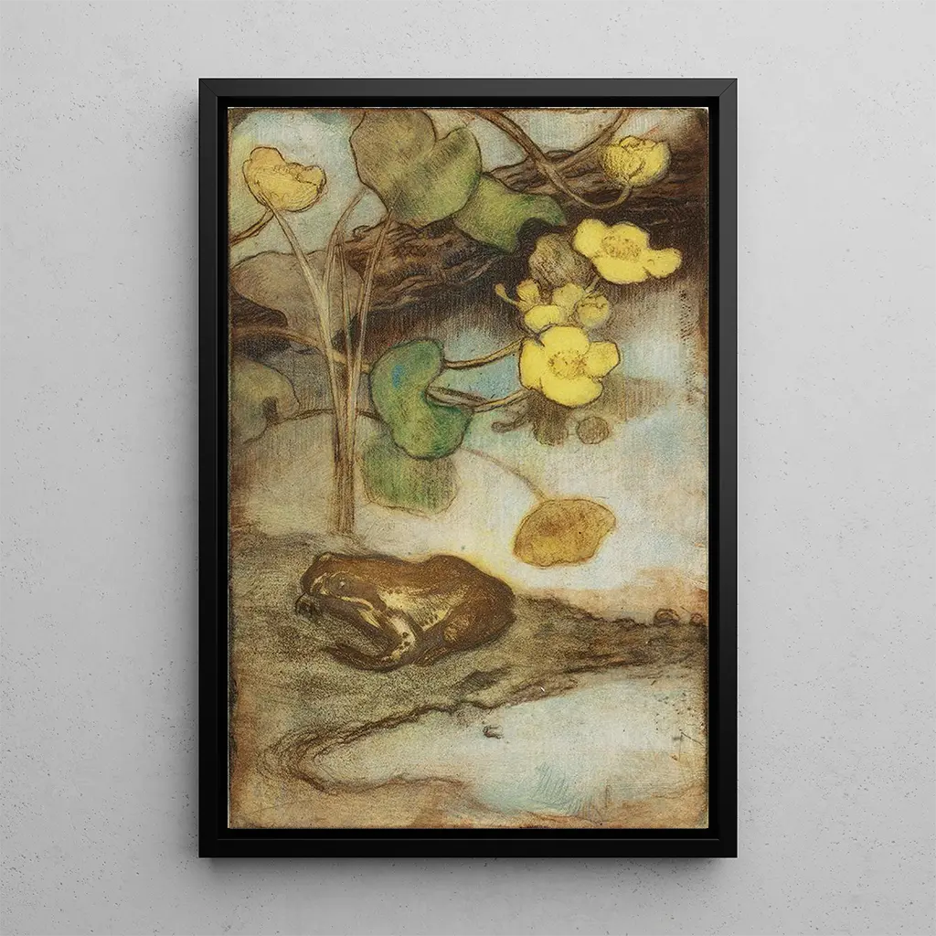 Druk artystyczny "Grenouille avec souci d'eau" Eero Järnefelt przenosi nas w spokojną i kontemplacyjną scenę. Obraz, bogaty w szczegóły, przedstawia delikatnie usadowioną na liściu żabę, otoczoną odcieniami zieleni i błękitu, które przywołują świeżość poranka nad brzegiem wody. Gra światła i cienia, a także precyzja linii, nadają dziełu spokojną i niemal magiczną atmosferę. Järnefelt, dzięki swojej impresjonistycznej technice, potrafi uchwycić istotę natury, zapraszając nas do docenienia piękna małych chwil życia.