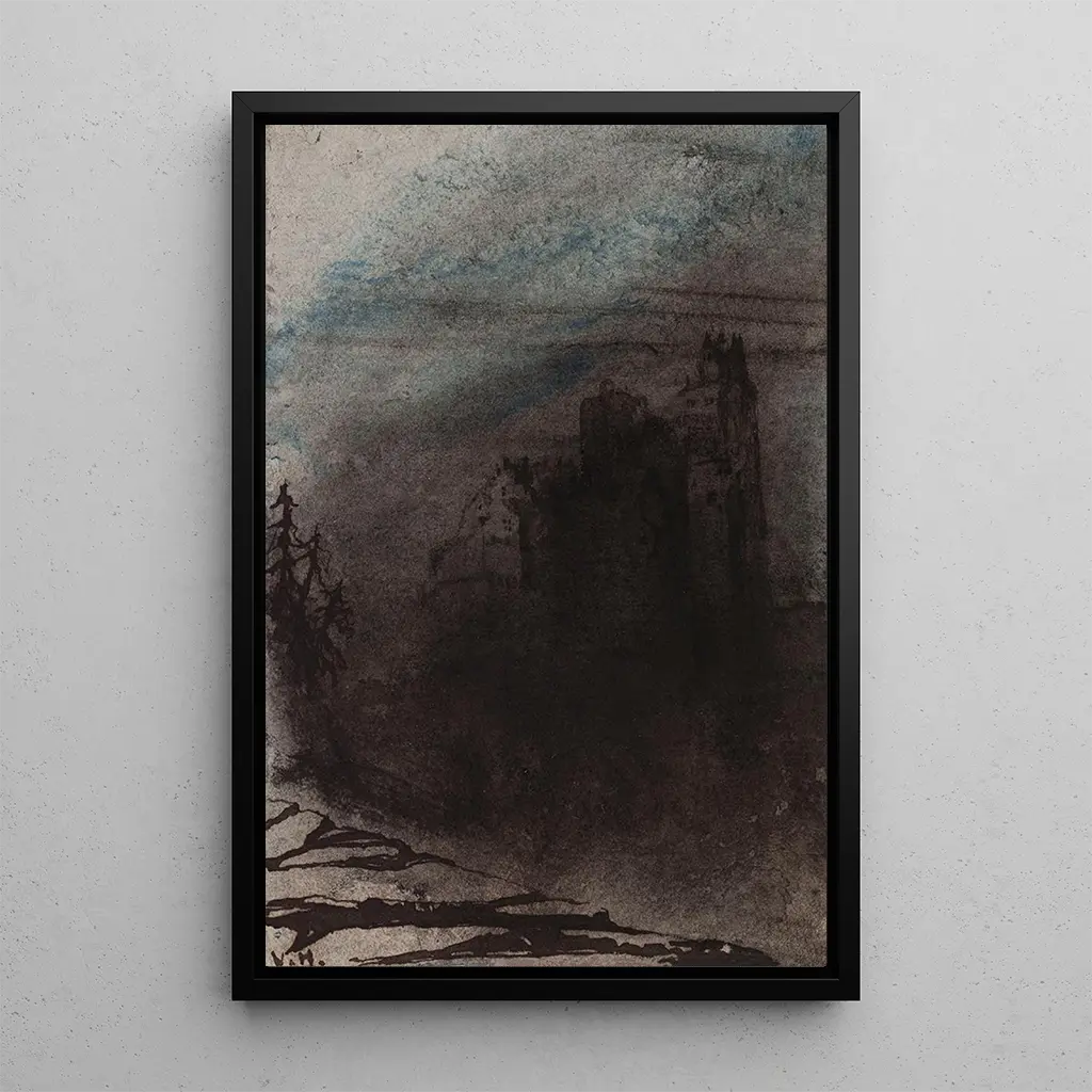 Dans cette œuvre captivante, Victor Hugo nous transporte au cœur d'un paysage où la majesté d'un château se dresse fièrement parmi des sapins élancés. Les couleurs, riches et nuancées, évoquent une atmosphère à la fois sereine et mystérieuse. La technique de l’aquarelle, avec ses délicates superpositions, permet de rendre la lumière d’une manière presque magique, accentuant les ombres et les reflets. Ce tableau, à la fois romantique et évocateur, invite le spectateur à une contemplation profonde, où chaque détail semble murmurer des histoires oubliées.