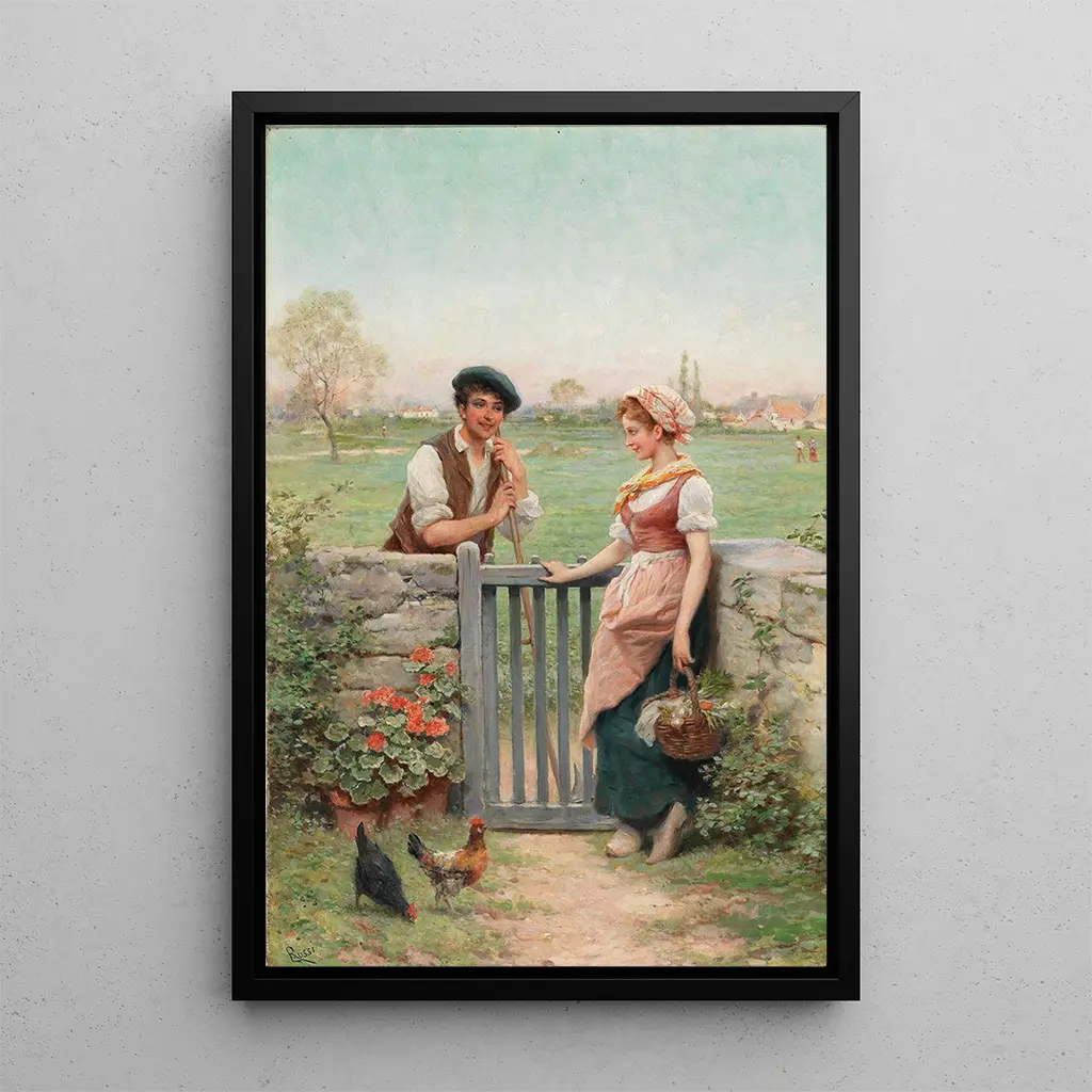 Badinage à la clôture : une scène de vie champêtre pleine de charme Dans cette druk artystyczny de Badinage à la clôture, Lucius Rossi capture un moment de légèreté et de complicité entre deux personnages. La composition est dominée par des couleurs douces et naturelles, évoquant la chaleur d'un après-midi ensoleillé. Les détails minutieux des vêtements et des expressions des protagonistes ajoutent une dimension vivante à la toile. La technique de Rossi, qui mêle habilement le réalisme et une touche impressionniste, crée une atmosphère de convivialité et de sérénité, transportant le spectateur dans un monde où le temps semble suspendu. Lucius Rossi : un maître du paysage et des scènes de genre Lucius Rossi, actif au XIXe siècle, est reconnu pour ses œuvres qui célèbrent la beauté de la nature et la vie quotidienne. Influencé par le mouvement romantique, il s'efforce de capturer l'essence de ses sujets avec une sensibilité unique. Son travail se situe à une époque où l'art se libère des conventions académiques, permettant une plus grande expression personnelle. Rossi a su s'imposer dans le milieu artistique grâce à sa capacité à évoquer des émotions profondes à travers des scènes simples, faisant de lui un artiste incontournable de son temps. Une acquisition décorative aux multiples atouts La reproduction de Badinage à la clôture est un choix idéal pour embellir votre intérieur, que ce soit dans un salon, un bureau ou une chambre. Sa qualité d'impression garantit une fidélité remarquable aux couleurs et aux détails de l'œuvre originale, tout en apportant une touche d'élégance à votre décoration. Ce tableau, avec sa scène paisible et charmante, invite à la contemplation et à la rêverie, faisant de chaque regard un moment de plaisir. En intégrant cette toile dans votre espace, vous ajoutez non seulement une œuvre d'art, mais aussi une atmosphère chaleureuse et accueillante.
