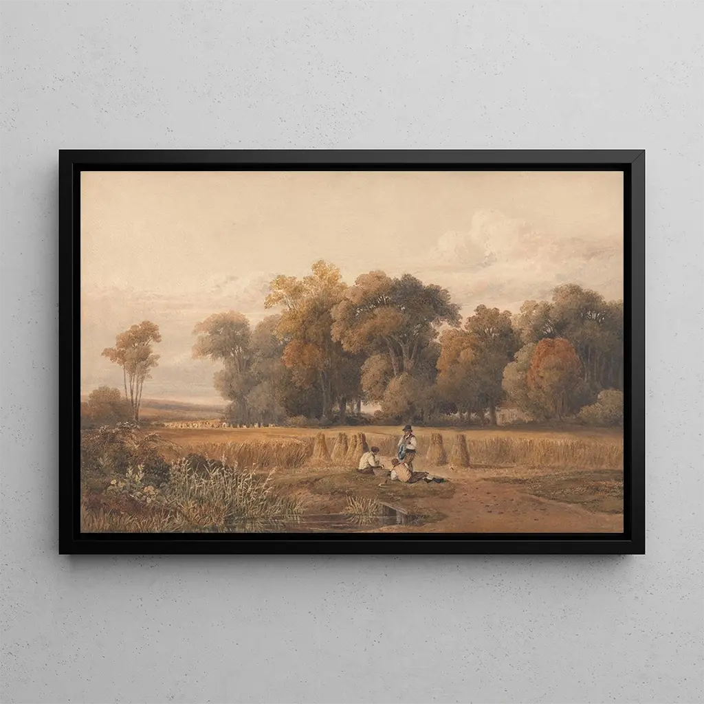 Dans "Récolte, le repos de midi", Charles Vincent Barber capture un moment de tranquillité au cœur d'une journée de travail. La composition met en avant des agriculteurs se reposant sous un ciel lumineux, où les nuances de vert des champs contrastent avec les teintes chaudes de la terre. Les détails minutieux des visages et des vêtements des personnages, ainsi que l'utilisation habile de la lumière, créent une atmosphère paisible et contemplative. Cette toile évoque non seulement l'effort des travailleurs, mais aussi la beauté des paysages ruraux, invitant le spectateur à s'immerger dans cette scène de vie simple et authentique.
