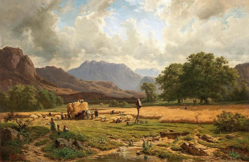 W "Zbiorze zboża w górach" Adolf Heinrich Lier przedstawia idylliczną scenę pełną spokoju i ciężkiej pracy. Obraz ukazuje rolników w pełni zaangażowania, zbierających plony swojej pracy pośród majestatycznego krajobrazu górskiego. Ciepłe kolory, od złotych pól po zielone wzgórza, tworzą harmonijną i żywą atmosferę. Technika Liera, łącząca realizm i impresjonizm, pozwala odczuć naturalne światło i teksturę elementów, czyniąc to dzieło zarówno żywym, jak i ponadczasowym.