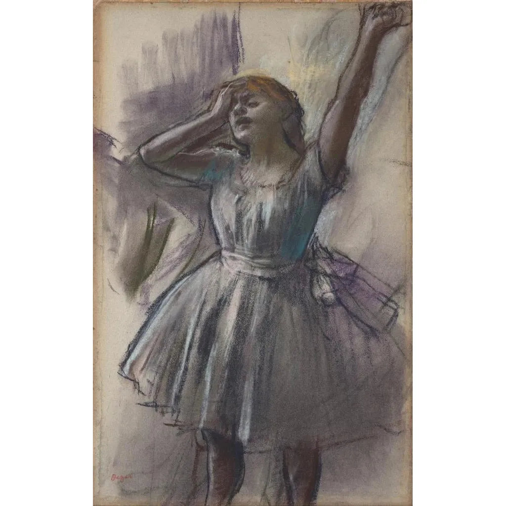 Druk artystyczny dzieła "Danseuse s'étirant" Edgara Degasa uchwyca ulotny moment z życia baletnicy. Kompozycja podkreśla smukłą sylwetkę tancerki, której ruchy wydają się niemal zawieszone w czasie. Pastelowe, delikatne kolory nawiązują do przytłumionego światła studia tanecznego, tworząc intymną atmosferę. Technika pastelowa, stosowana przez Degasa, pozwala oddać teksturę tkanin i skóry tancerki z dużą finezją, podkreślając piękno i skupienie artysty podczas przygotowań.